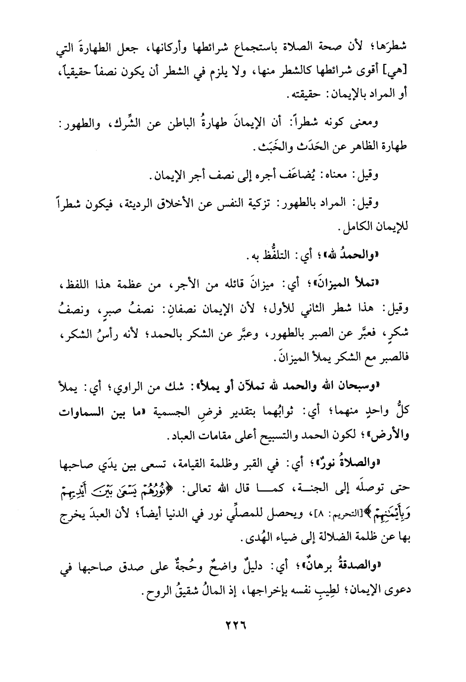 ومعنى كونه شطرًا: أن الإيمانَ طهارةُ الباطن عن الشِّرك، والطهور: طهارة الظاهر عن الحَدَث والخَبَث.
