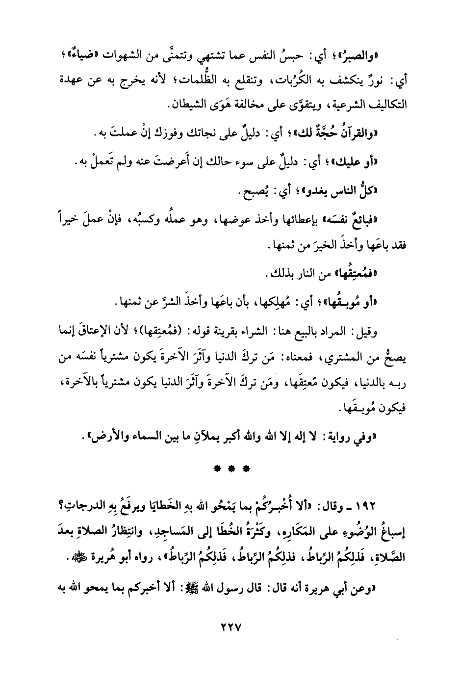 192 - وقال: "ألا أُخْبرُكُمْ بما يَمْحُو الله بهِ الخَطايَا ويرفَعُ بِهِ الدرجاتِ؟ إسباغُ الوُضُوءِ على المَكَارِهِ، وكَثْرَةُ الخُطَا إلى المَساجِدِ، وانتِظارُ الصلاةِ بعدَ الصَّلاةِ، فَذلِكُمُ الرِّباطُ، فذلِكُمُ الرِّباطُ، فَذلِكُمُ الرِّباطُ"، رواه أبو هُريرة - رضي الله عنه -.