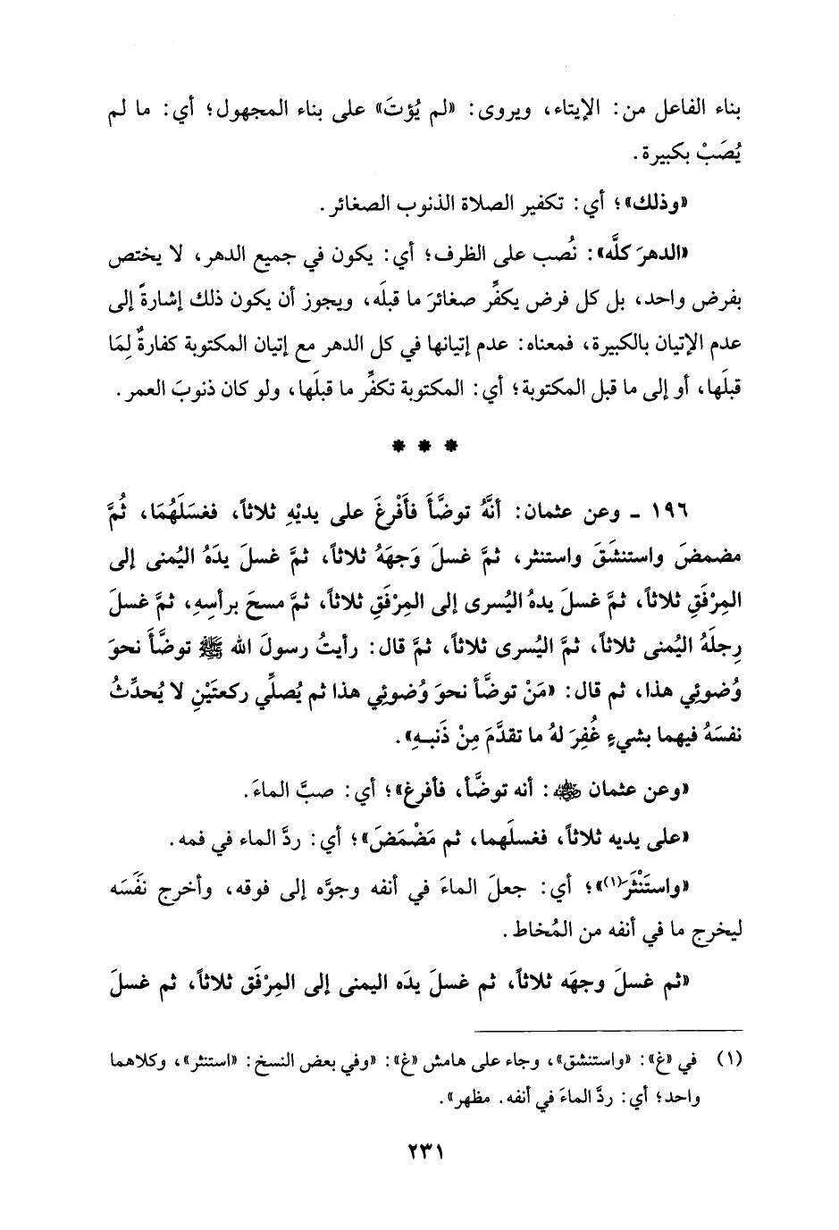 196 - وعن عثمان: أنَّهُ توضَّأَ فأَفْرغَ على يديْهِ ثلاثًا، فغسَلَهُمَا، ثُمَّ مضمضَ واستنشَقَ واستنثر، ثمَّ غسلَ وَجهَهُ ثلاثًا، ثمَّ غسلَ يدَهُ اليُمنى إلى المِرْفَقِ ثلاثًا، ثمَّ غسلَ يدهُ اليُسرى إلى المِرْفَقِ ثلاثًا، ثمَّ مسحَ برأسِهِ، ثمَّ غسلَ رِجلَهُ اليُمنى ثلاثًا، ثمَّ اليُسرى ثلاثًا، ثمَّ قال: رأيتُ رسولَ الله - صلى الله عليه وسلم - توضَّأَ نحوَ وُضوئِي هذا، ثم قال: "مَنْ توضَّأ نحوَ وُضوئِي هذا ثم يُصلِّي ركعتَيْنِ لا يُحدِّثُ نفسَهُ فيهما بشيء غُفِرَ لهُ ما تقدَّمَ مِنْ ذَنبهِ".