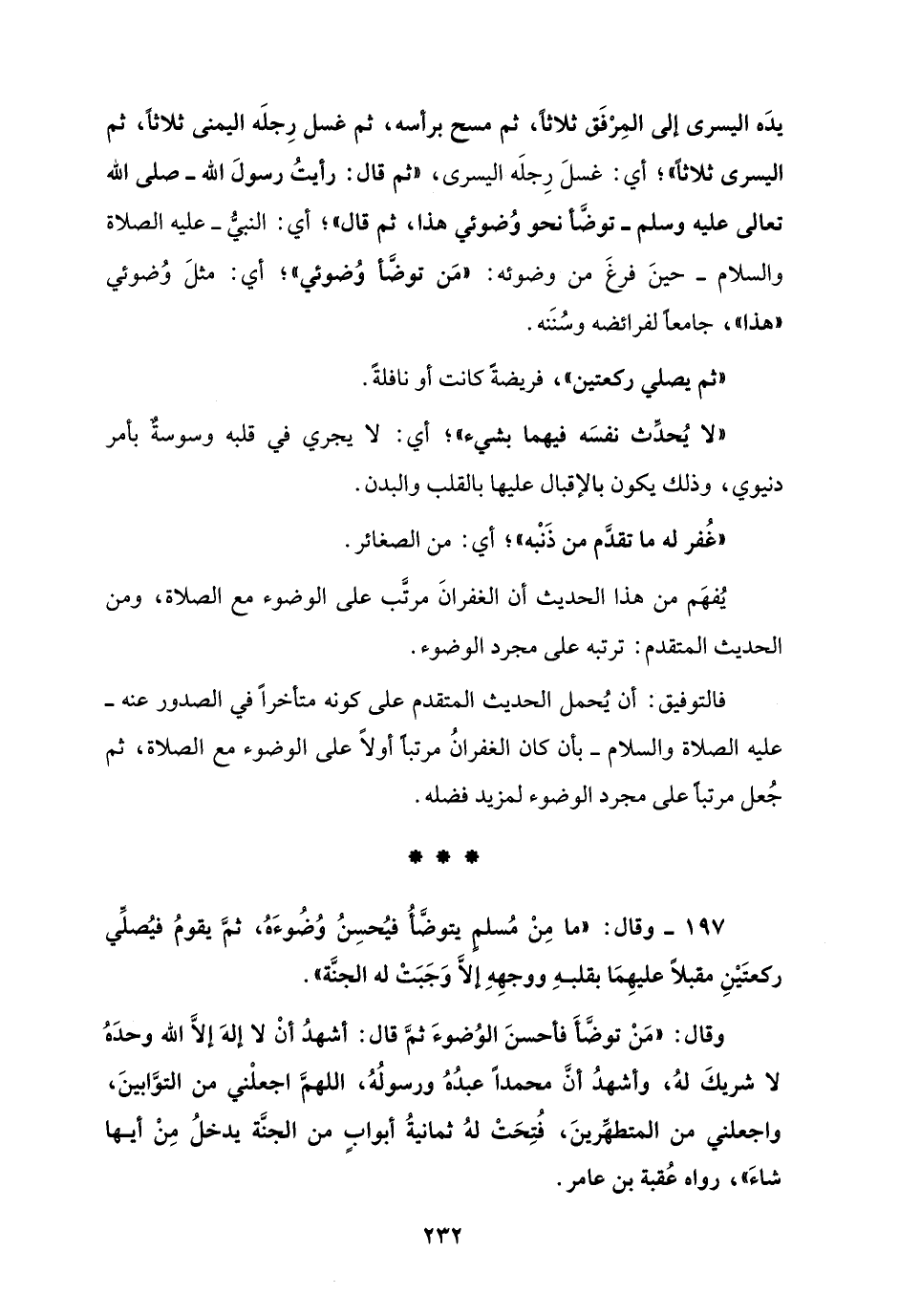 197 - وقال: "ما مِنْ مُسلمٍ يتوضَّأُ فيُحسِنُ وُضُوءَهُ، ثمَّ يقومُ فيُصلِّي ركعتَيْنِ مقبلًا عليهِمَا بقلبهِ ووجهِهِ إلاَّ وَجَبَتْ له الجنَّة".