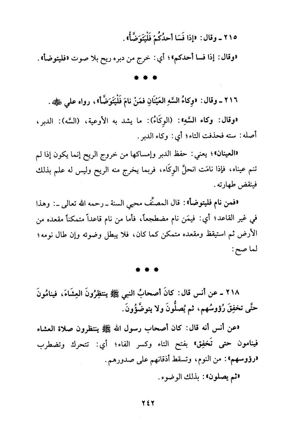 216 - وقال: "وِكاءُ السَّهِ العَيْنَانِ فمَنْ نامَ فَلْيَتَوَضَّأ"، رواه علي - رضي الله عنه -.
