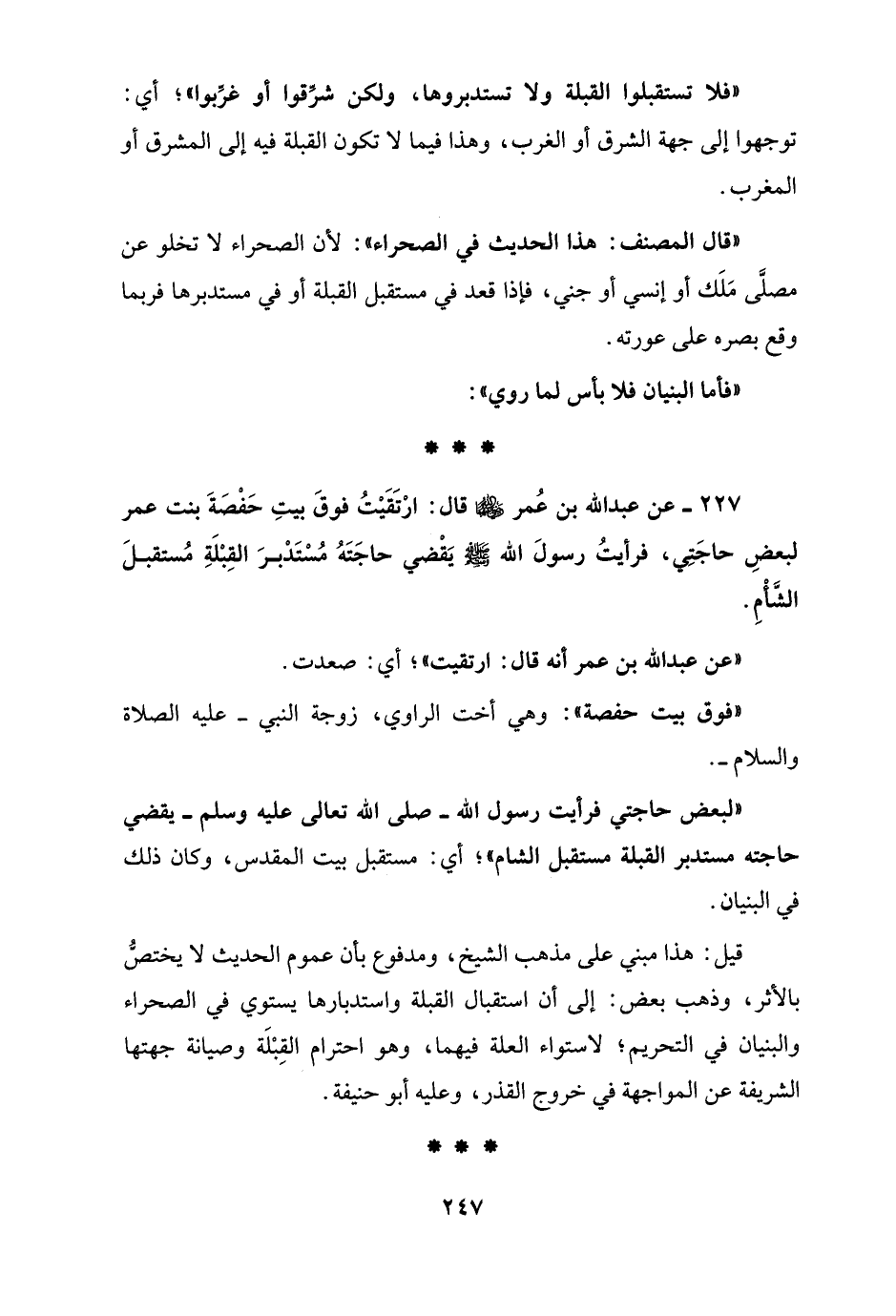 227 - عن عبد الله بن عُمر - رضي الله عنهما - قال: ارْتَقَيْتُ فوقَ بيتِ حَفْصَةَ بنت عمر لبعضِ حاجَتِي، فرأيتُ رسولَ الله - صلى الله عليه وسلم - يَقْضي حاجَتَهُ مُسْتَدْبرَ القِبْلَةِ مُستقبلَ الشَّأْمِ.