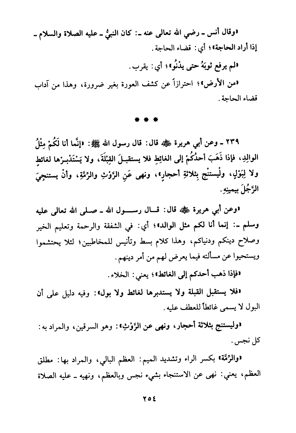 239 - وعن أبي هريرة - رضي الله عنه - قال: قال رسول الله: "إنَّما أنا لَكُمْ مِثْلُ الوالِدِ، فإذا ذَهَبَ أحدُكُم إلى الغائِطِ فلا يستقبلَ القِبْلَةَ، ولا يَسْتَدْبرْها لغائطٍ ولا لِبَوْلٍ، ولْيستنْج بِثلاثةِ أحجارٍ"، ونهى عَنِ الرَّوْثِ والرِّمَّةِ، وأنْ يستنجِيَ الرَّجُلَ بيمينِهِ.