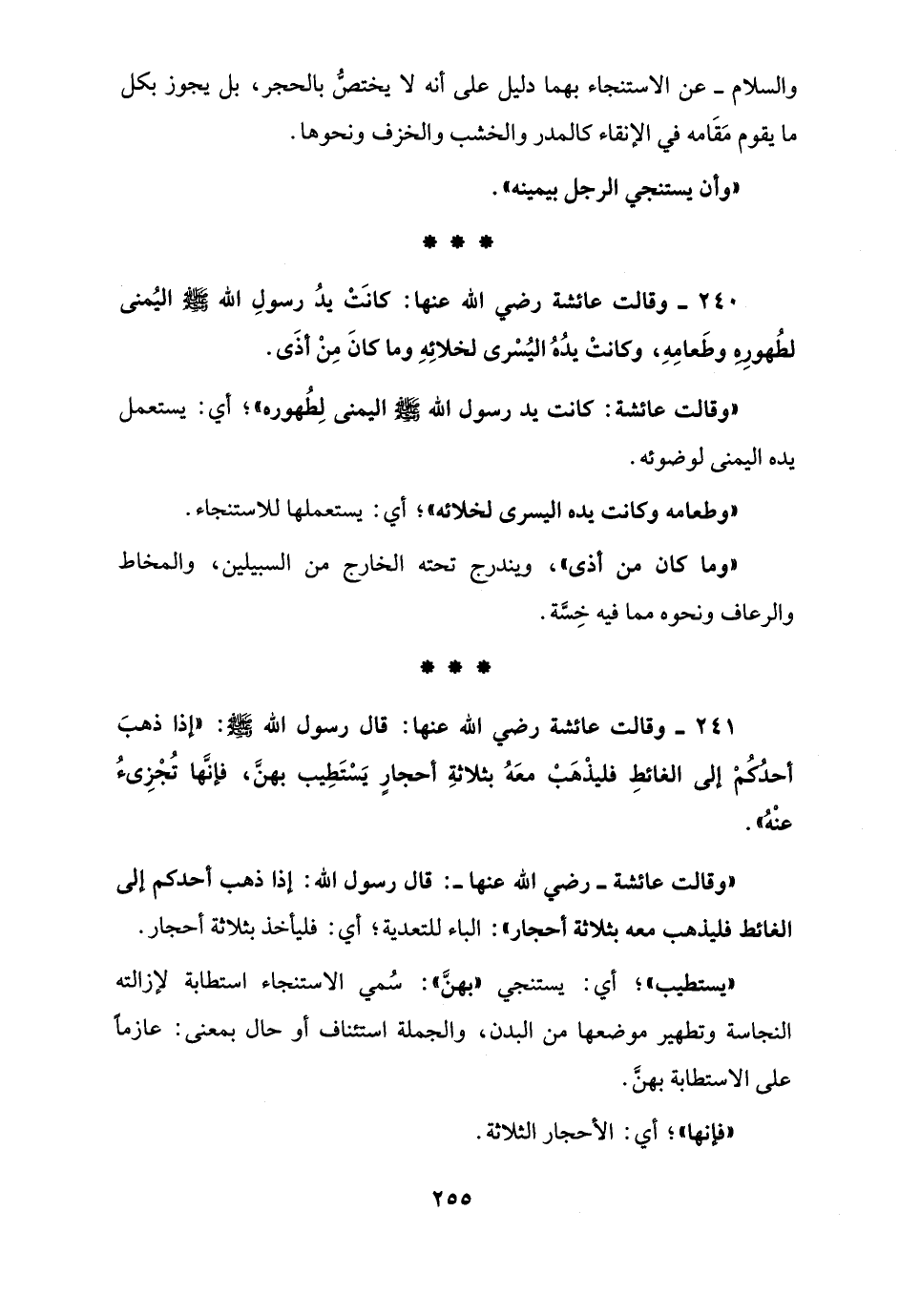 240 - وقالت عائشة رضي الله عنها: كانَتْ يدُ رسولِ الله - صلى الله عليه وسلم - اليُمنى لطُهورِهِ وطَعامِهِ، وكانتْ يدُهُ اليُسْرى لخلائِهِ وما كانَ مِنْ أذَى.