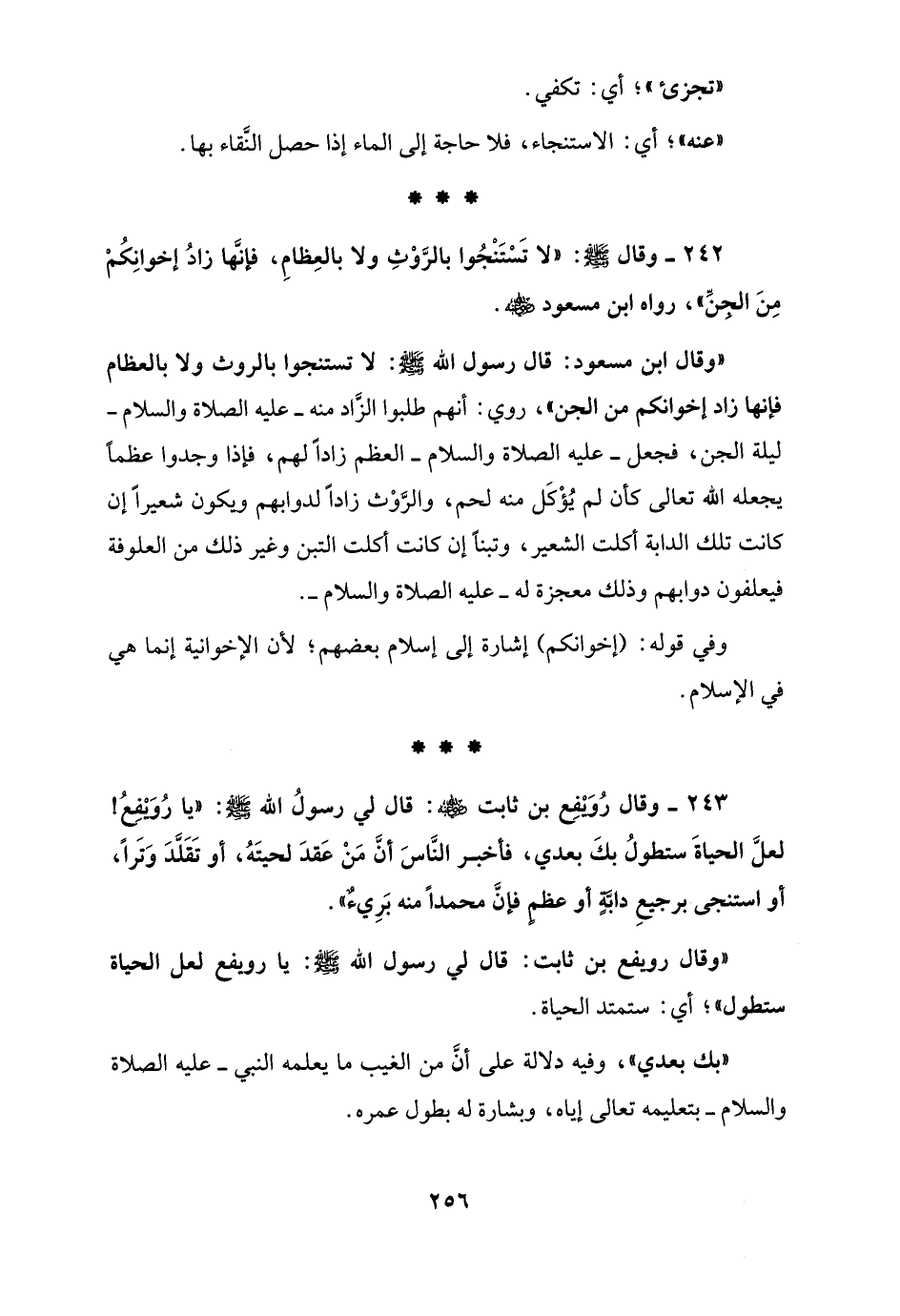 242 - وقال - صلى الله عليه وسلم -: "لا تَسْتَنْجُوا بالرَّوْثِ ولا بالعِظامِ، فإنَّها زادُ إخوانِكُمْ مِنَ الجِنِّ"، رواه ابن مسعود - رضي الله عنه -.