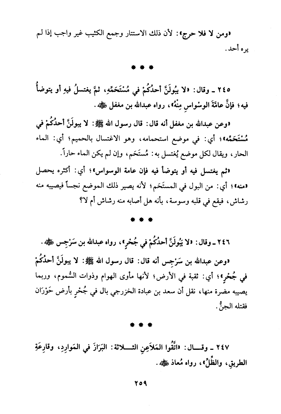 246 - وقال: "لا يَبُولَنَّ أحدُكُمْ في جُحْرٍ"، رواه عبد الله بن سَرْجِس - رضي الله عنه -.