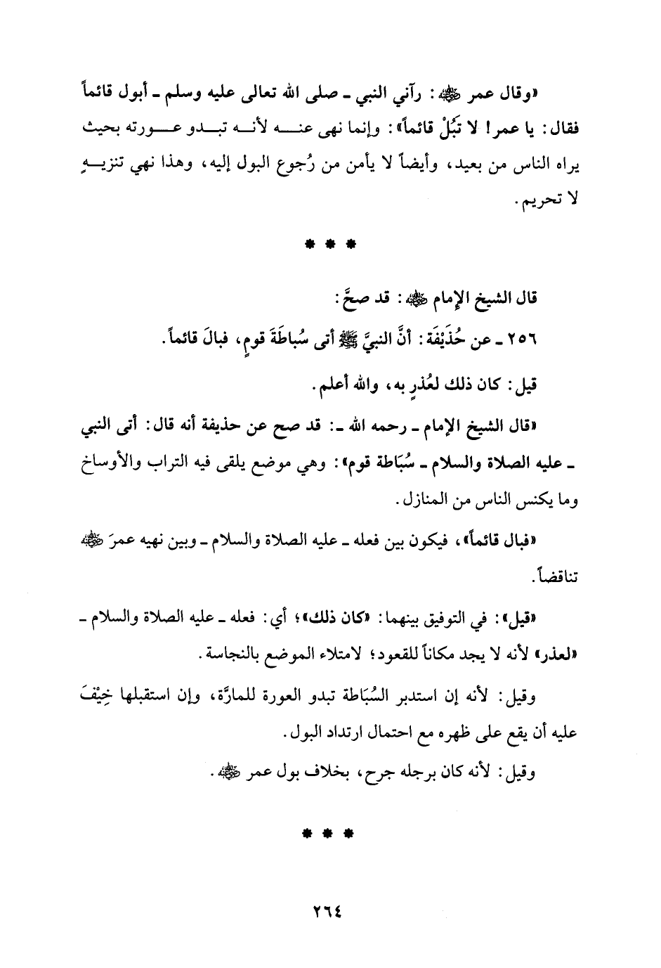 "وقال عمر - رضى الله عنه -: رآني النبي - صلى الله تعالى عليه وسلم - أبول قائماً فقال: يا عمر! لا تبل قائمًا": وإنما نهى عنه لأنه تبدو عورته بحيث يراه الناس من بعيد، وأيضاً لا يأمن من رُجوع البول إليه، وهذا نهي تنزيه لا تحريم.