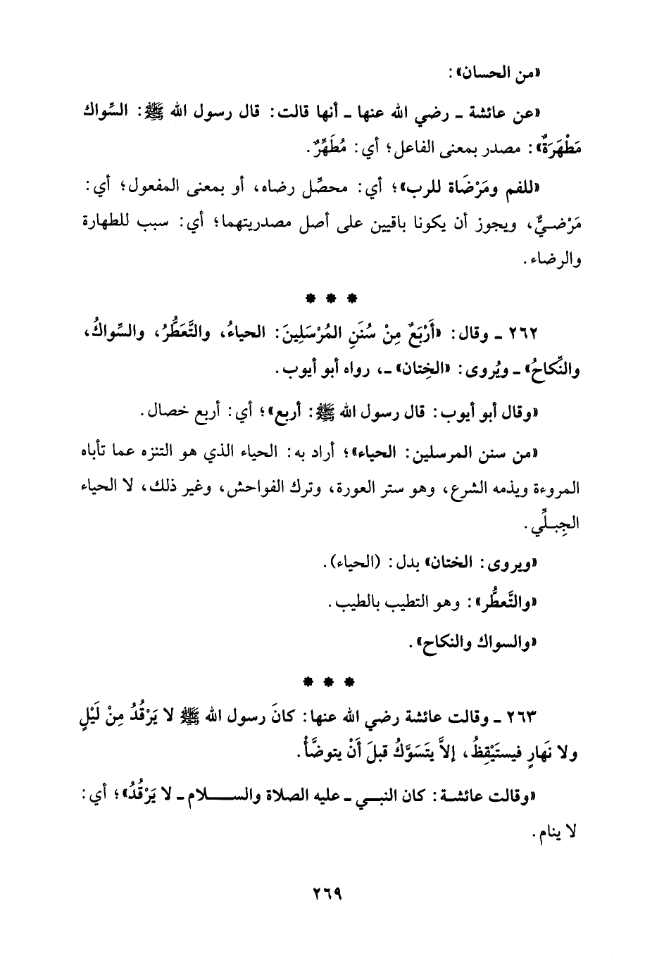 262 - وقال: "أَرْبَعٌ مِنْ سُنَنِ المُرسَلِينَ: الحياء والتَّعَطُّرُ، والسِّواكُ، والنكّاحُ، - ويُروى: "الخِتان" -، رواه أبو أيوب.