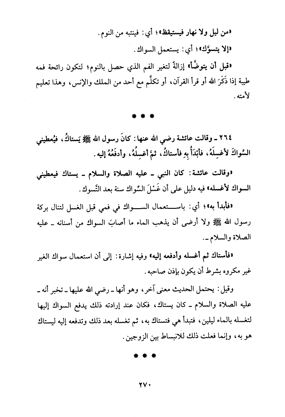 264 - وقالت عائشة رضي الله عنها: كانَ رسول الله - صلى الله عليه وسلم - يَستاكُ، فيُعطيني السِّواكَ لأغسِلَهُ، فأبْدَأُ بِهِ فاستاكُ، ثمَّ أغسِلُهُ، وأدفَعُهُ إليه.