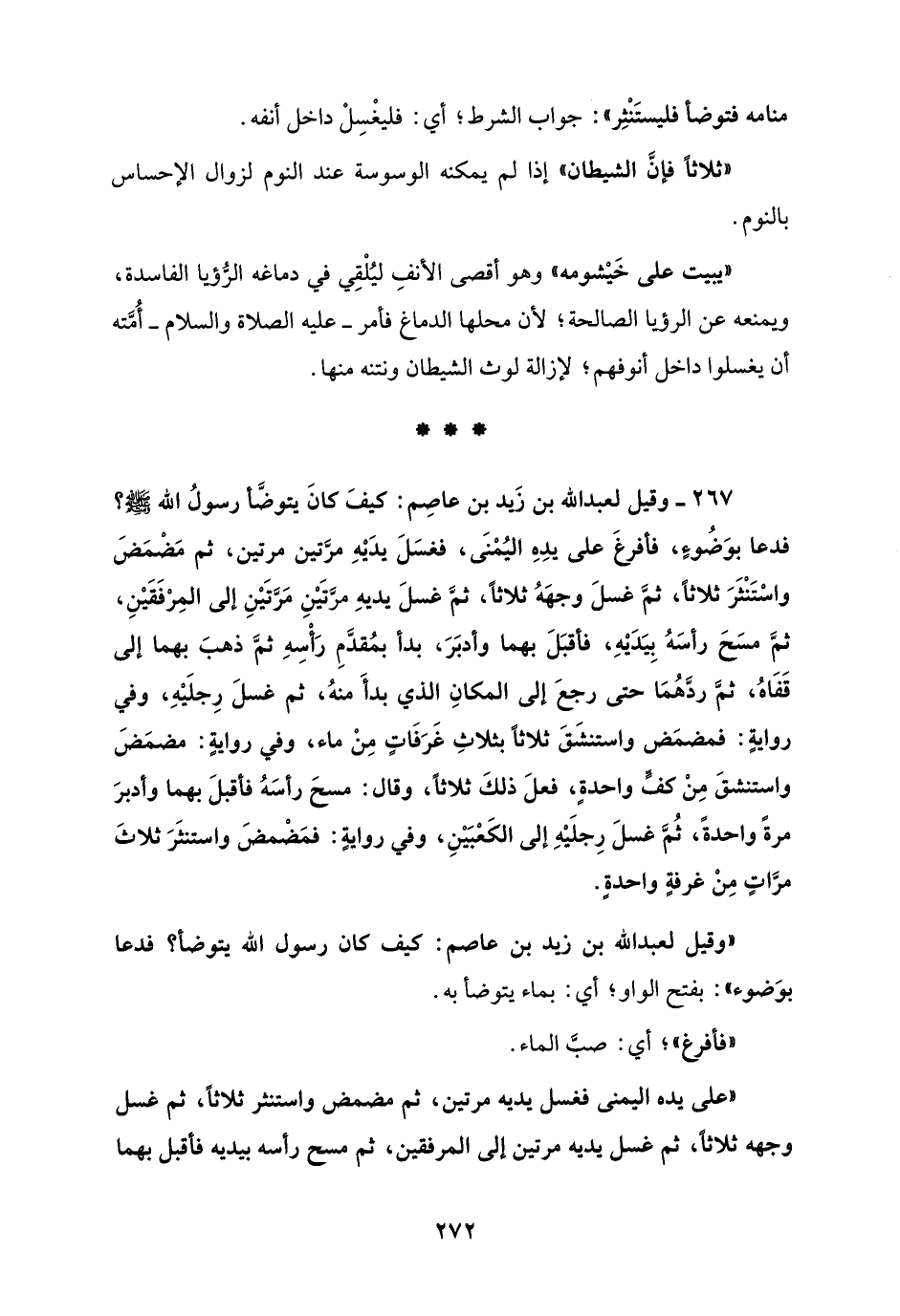 267 - وقيل لعبد الله بن زَيد بن عاصم: كيفَ كانَ يتوضَّأ رسولُ الله - صلى الله عليه وسلم -؟ فدعا بوَضُوءٍ، فأفرغَ على يده اليُمْنَى، فغسَلَ يدَيْهِ مرَّتين مرتين، ثم مَضْمَضَ واسْتَنْثَرَ ثلاثاً، ثمَّ غسلَ وجهَهُ ثلاثاً، ثمَّ غسلَ يديهِ مرَّتَيْنِ مَرَّتَيْنِ إلى المِرْفَقَيْنِ، ثمَّ مسَحَ رأسَهُ بِيَدَيْهِ، فأقبَلَ بهما وأدبَرَ، بدأ بمُقدَّمِ رَأْسِهِ ثمَّ ذهبَ بهما إلى قَفَاهُ، ثمَّ ردَّهُمَا حتى رجعَ إلى المكانِ الذي بدأَ منهُ، ثم غسلَ رِجلَيْهِ، وفي روايةٍ: فمضمَض واستنشَقَ ثلاثاً بثلاثِ غَرَفَاتٍ مِنْ ماء، وفي روايةٍ: مضمَضَ واستنشقَ مِنْ كفٍّ واحدةٍ، فعلَ ذلكَ ثلاثاً، وقال: مسحَ رأسَهُ فأقبلَ بهما وأدبرَ مرةً واحدةً، ثُمَّ غسلَ رِجلَيْهِ إلى الكَعْبَيْنِ، وفي روايةٍ: فمَضْمض واستنثَرَ ثلاثَ مرَّاتٍ مِنْ غرفةٍ واحدةٍ.