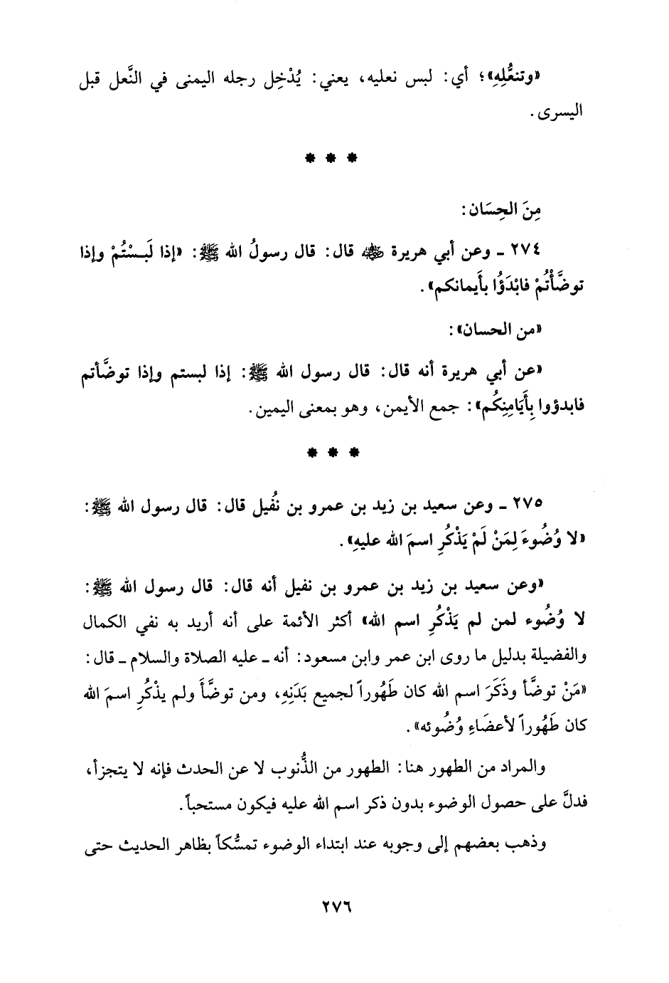 275 - وعن سعيد بن زيد بن عمرو بن نُفيل قال: قال رسول الله - صلى الله عليه وسلم -: "لا وُضُوءَ لِمَنْ لَمْ يَذْكُرِ اسمَ الله عليهِ".