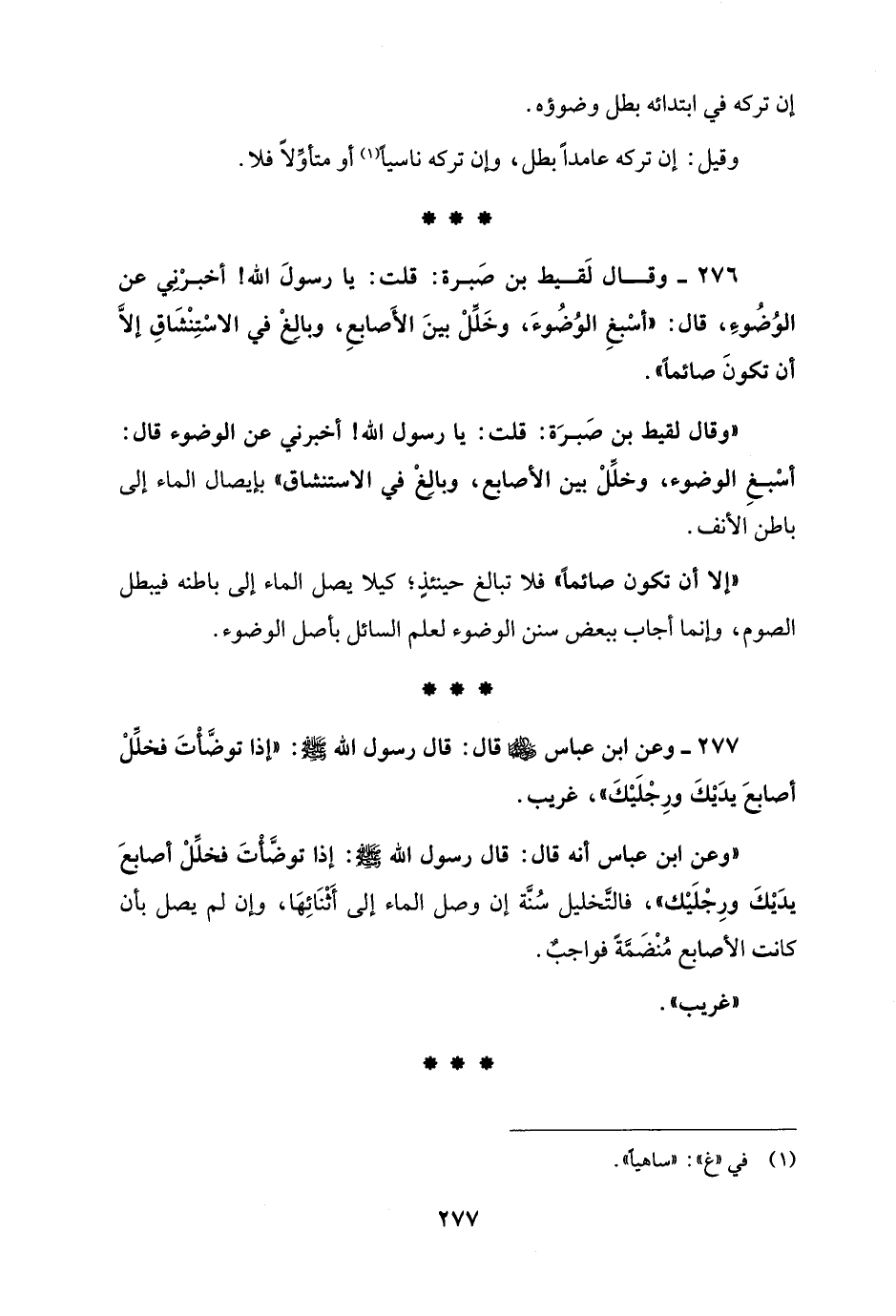 277 - وعن ابن عباس قال: قال رسول الله - صلى الله عليه وسلم -: "إذا توضَّأتَ فخللْ أصابعَ يدَيْكَ ورِجْلَيْكَ"، غريب.