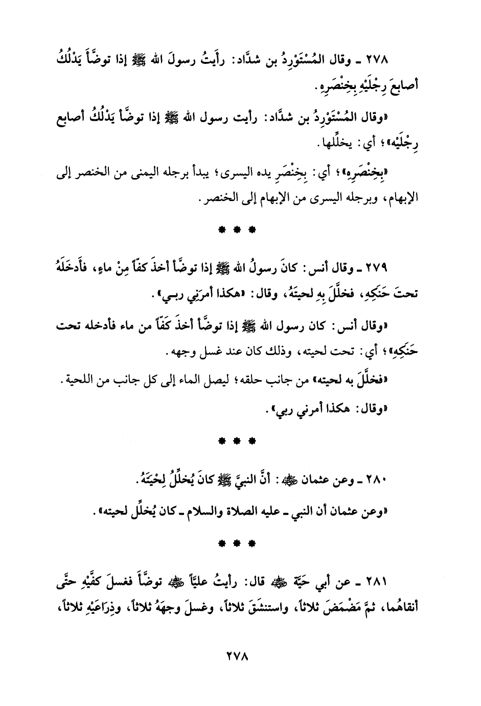 278 - وقال المُسْتَوْرِدُ بن شدَّاد: رأَيتُ رسولَ الله - صلى الله عليه وسلم - إذا توضَّأ يَدْلُكُ أصابعَ رِجْلَيْهِ بِخِنْصَرِه.