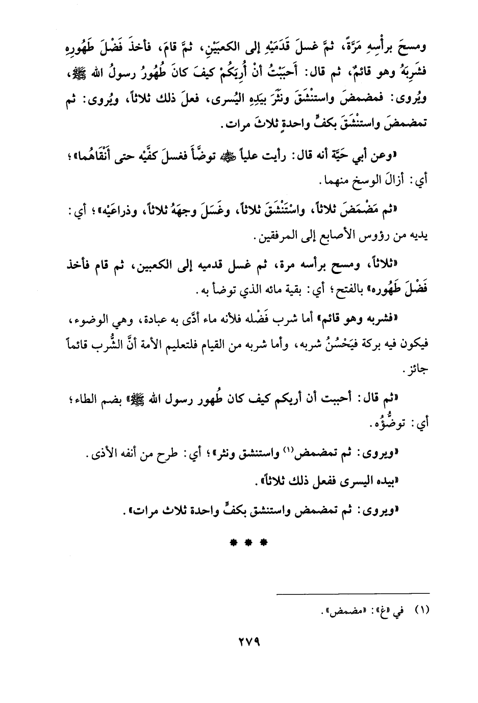 ومسحَ برأْسِهِ مَرَّة، ثمَّ غسلَ قَدَمَيْهِ إلى الكعبَيْنِ، ثمَّ قامَ، فأخذَ فَضْلَ طَهُورِه فشَرِبَهُ وهو قائم، ثم قال: أَحبَبْتُ أنْ أُرِيَكُمْ كيفَ كانَ طُهُورُ رسولُ الله - صلى الله عليه وسلم -، ويُروى: فمضمضَ واستنْشَقَ ونثرَ بيَده اليُسرى، فعلَ ذلك ثلاثاً، ويُروى: ثم تمضمضَ واستنْشَقَ بكفٍّ واحدةٍ ثلاثَ مرات.