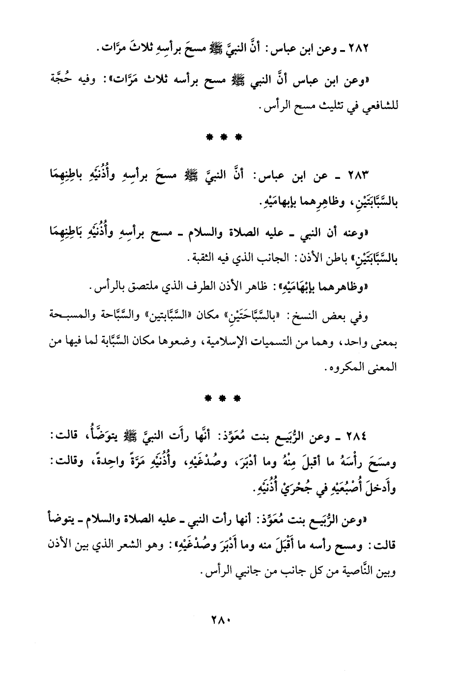 282 - وعن ابن عباس: أنَّ النبيَّ - صلى الله عليه وسلم - مسحَ برأسِهِ ثلاثَ مرَّات.