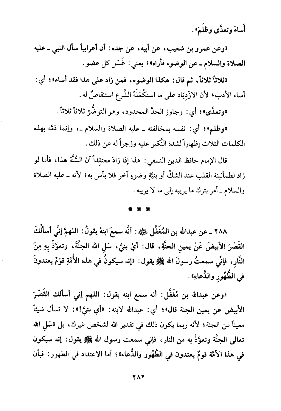 288 - عن عبد الله بن المُغَفَّل - رضى الله عنه -: أنَّه سمعَ ابنهُ يقولُ: اللهمَّ إنِّي أسألُكَ القَصْرَ الأبيضَ عَنْ يمينِ الجنَّةِ، قال: أيْ بنيَّ، سَلِ الله الجنَّةَ، وتعوَّذْ بِهِ مِنَ النَّارِ، فإني سمعتُ رسولَ الله - صلى الله عليه وسلم - يقول: "إنه سيكونُ في هذه الأُمَّةِ قوْمٌ يعتدونَ في الطُّهُورِ والدُّعاء".