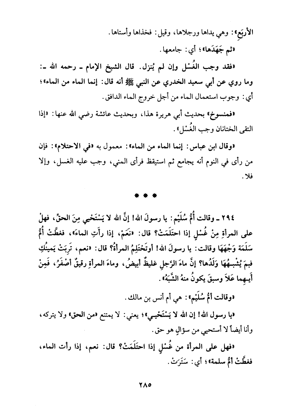 294 - وقالت أُمُّ سُلَيْم: يا رسولَ الله! إنَّ الله لا يَسْتَحْيي مِنَ الحقّ، فهلْ على المرأةِ مِنْ غُسْلٍ إذا احتَلَمَتْ؟ قال: "نعمْ، إذا رأَتِ الماءَ"، فغطَّتْ أُم سَلَمَة وَجْهَهَا وقالت: يا رسولَ الله! أوتَحْتَلِمُ المرأةُ؟ قال: "نعم، تَرِبَتْ يَمينُكِ فبمَ يُشْبهُهَا وَلَدُها؟ إنَّ ماءَ الرجلِ غليظٌ أبيض، وماءَ المرأةِ رقيقٌ أصْفَرُ، فَمِنْ أَيهِما عَلاَ وسبقَ يكونُ منهُ الشَّبَهُ".