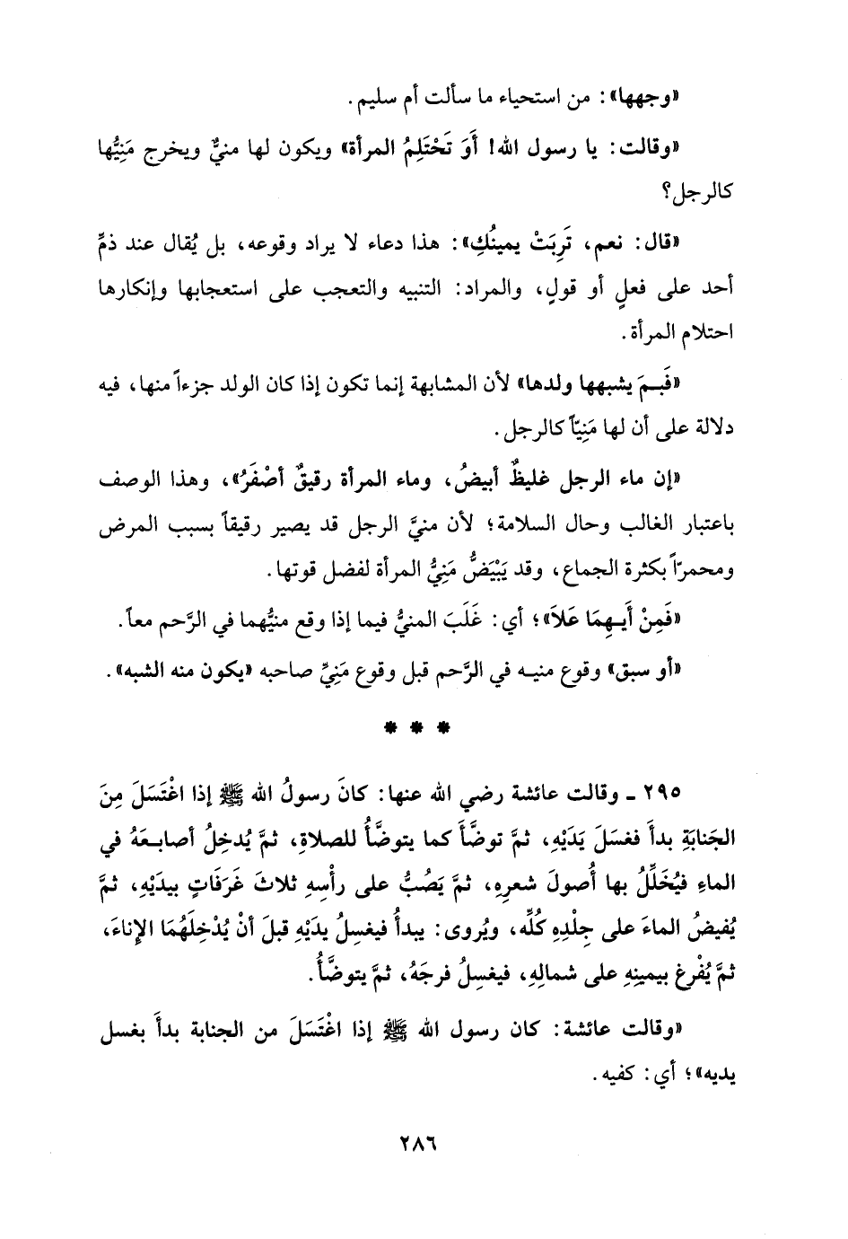 295 - وقالت عائشة رضي الله عنها: كانَ رسولُ الله - صلى الله عليه وسلم - إذا اغتَسَلَ مِنَ الجَنابَةِ بدأَ فغسَلَ يَدَيْهِ، ثمَّ توضَّأ كما يتوضَّأُ للصلاةِ، ثمَّ يُدخِلُ أصابعَهُ في الماء فيُخَلَّلُ بها أُصولَ شعرِه، ثمَّ يَصُبّ على رأْسِهِ ثلاثَ غَرَفَاتٍ بيدَيْهِ، ثمَّ يُفيضُ الماءَ على جِلْدِهِ كلِّه، ويُروى: يبدأُ فيغسِلُ يدَيْهِ قبلَ أنْ يُدْخِلَهُمَا الإناءَ، ثمَّ يُفْرغ بيمينِهِ على شمالِهِ، فيغسِلُ فرجَهُ، ثمَّ يتوضَّأُ.