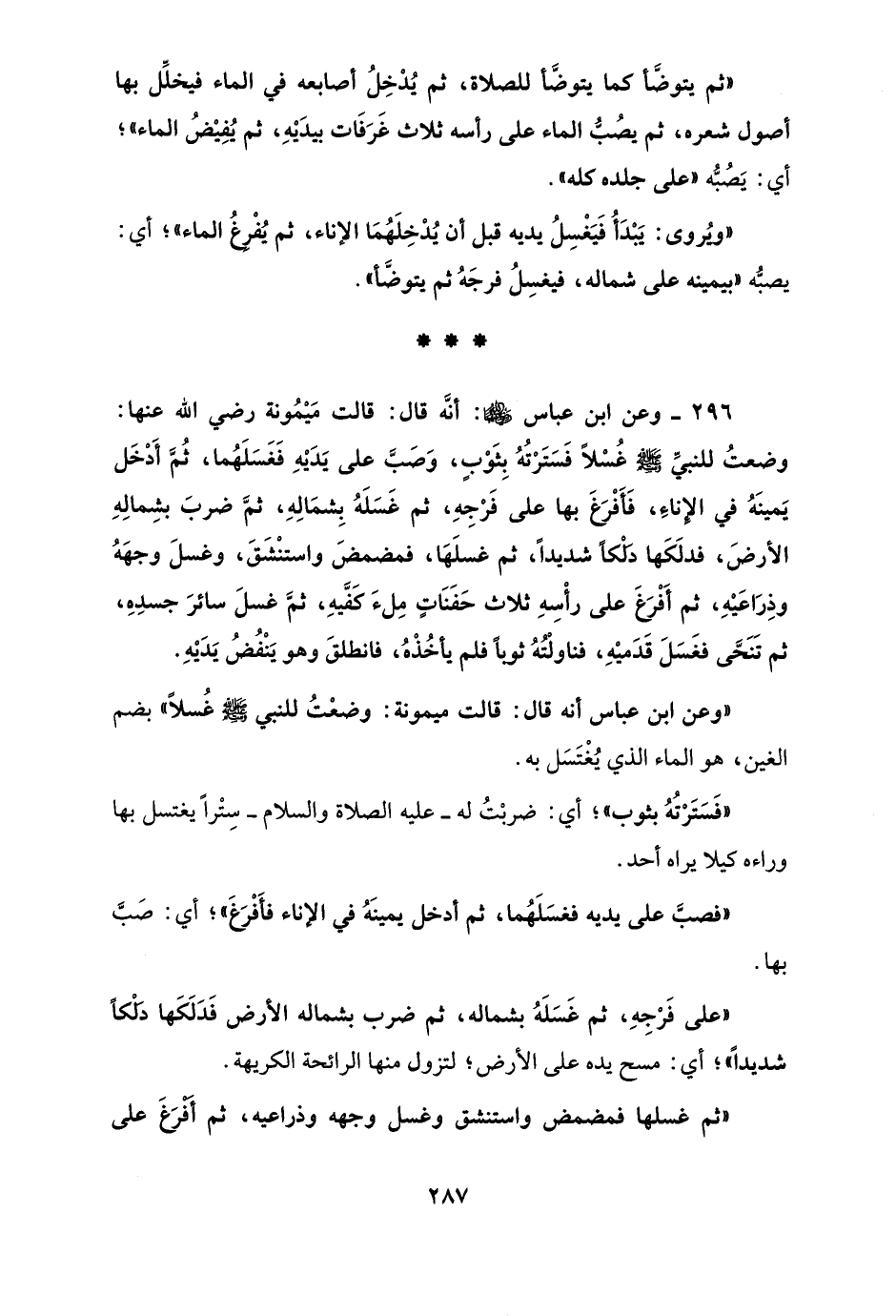 296 - وعن ابن عباس - رضي الله عنه -: أنَّه قال: قالت مَيْمُونة رضي الله عنها: وضعتُ للنبي - صلى الله عليه وسلم - غسْلاً فَسَتَرْتُهُ بِثَوْبٍ، وَصَبَّ على يَدَيْهِ فَغَسَلَهُما، ثُمَّ أَدْخَل يَمينَهُ في الإناءَ، فَأفْرَغَ بها على فَرجِهِ، ثم غسَلَهُ بِشمَالِهِ، ثم ضربَ بشِمالِهِ الأرضَ، فدلَكَها دلْكاً شديداً، ثم غسلَهَا، فمضمضَ واستنْشَقَ، وغسلَ وجهَهُ وذِرَاعَيْهِ، ثم أَفْرَغَ على رأْسِهِ ثلاث حَفَنَاتٍ مِلءَ كَفَّيهِ، ثم غسلَ سائرَ جسدِهِ، ثم تَنَحَّى فغَسَلَ قَدَميْهِ، فناولْتُهُ ثوباً فلم يأخُذْهُ، فانطلقَ وهو يَنْفُض يَدَيْهِ.