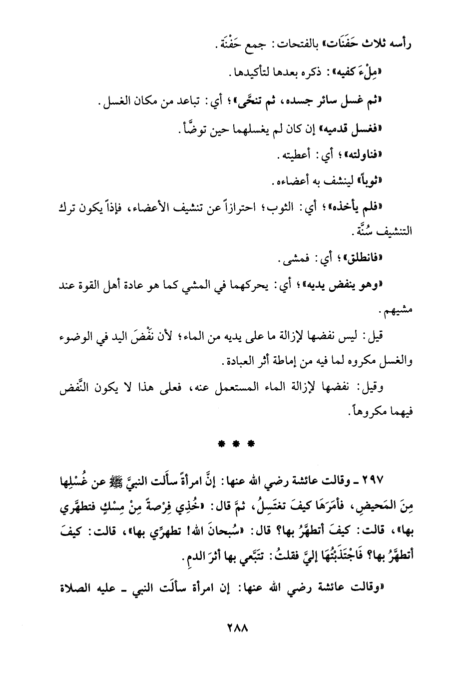 297 - وقالت عائشة رضي الله عنها: إن امرأةً سأَلت النبيَّ - صلى الله عليه وسلم - عن غُسلِها مِنَ المَحيضِ، فأمَرَهَا كيفَ تغتَسِلُ، ثمَّ قال: "خُذِي فِرْصة مِنْ مِسْكٍ فتطهري بها"، قالت: كيفَ أتطهَّرُ بها؟ قال: "سُبحانَ الله! تطهرِّي بها"، قالت: كيفَ أتطهَّرُ بها؟ فَاجْتَذَبْتُهَا إليَّ فقلتُ: تتَبَّعي بها أثرَ الدمِ.