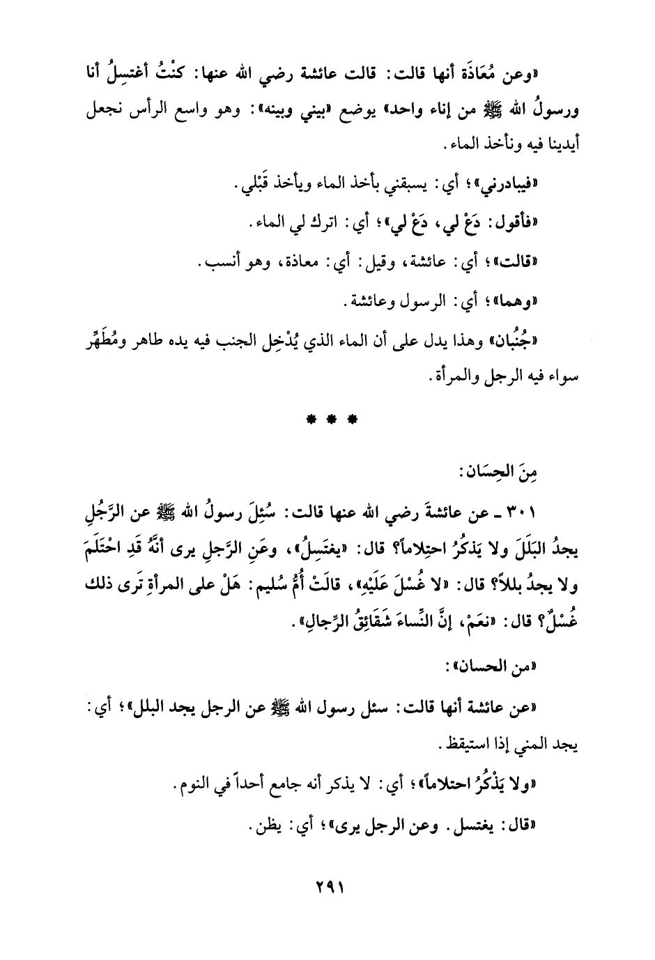 301 - عن عائشةَ رضي الله عنها قالت: سُئِلَ رسولُ الله - صلى الله عليه وسلم - عن الرَّجُلِ يجدُ البَلَلَ ولا يَذكُرُ احتِلاماً؛ قال: "يغتَسِلُ"، وعَنِ الرَّجلِ يرى أنَّهُ قَدِ احْتَلَمَ ولا يجدُ بللاً؟ قال: "لا غسْلَ عَلَيْهِ"، قالَتْ أُمُّ سُليم: هَلْ على المرأةِ تَرى ذلك غسْل؟ قال: "نعَمْ، إنَّ النِّساءَ شَقَائِقُ الرِّجالِ".