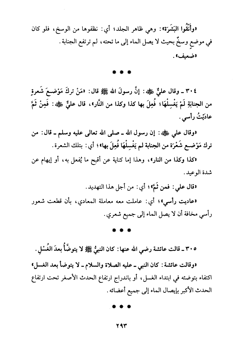 304 - وقال علي - رضى الله عنه -: إنَّ رسولَ الله - صلى الله عليه وسلم - قال: "مَنْ تركَ مَوْضعِ شَعرةٍ من الجنابَةِ لَمْ يَغْسِلْهَا؛ فُعِلَ بها كذا وكذا من النَّار"، قال علي - رضي الله عنه -: فمِنْ ثَمَّ عاديتُ رأسي.