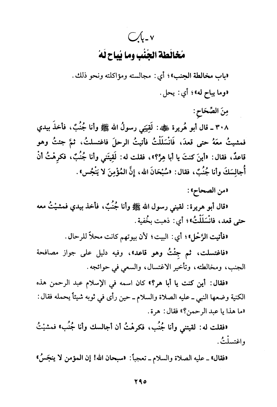 308 - قال أبو هُريرة - رضي الله عنه -: لَقِيني رسولُ الله - صلى الله عليه وسلم - وأنا جُنُب، فأخذَ بيدي فمشيتُ معَهُ حتى قعدَ، فَانْسَلَلْتُ فأتيتُ الرحلَ فاغتسلتُ، ثمَّ جئتُ وهو قاعدٌ، فقال: "أينَ كنتَ يا أبا هِر؟ "، فقلت له: لَقِيتَني وأنا جُنُب، فكرِهْتُ أنْ أُجالِسَكَ وأنا جُنُب، فقال: "سُبْحَانَ الله، إِنَّ المُؤْمِنَ لا يَنْجُس".