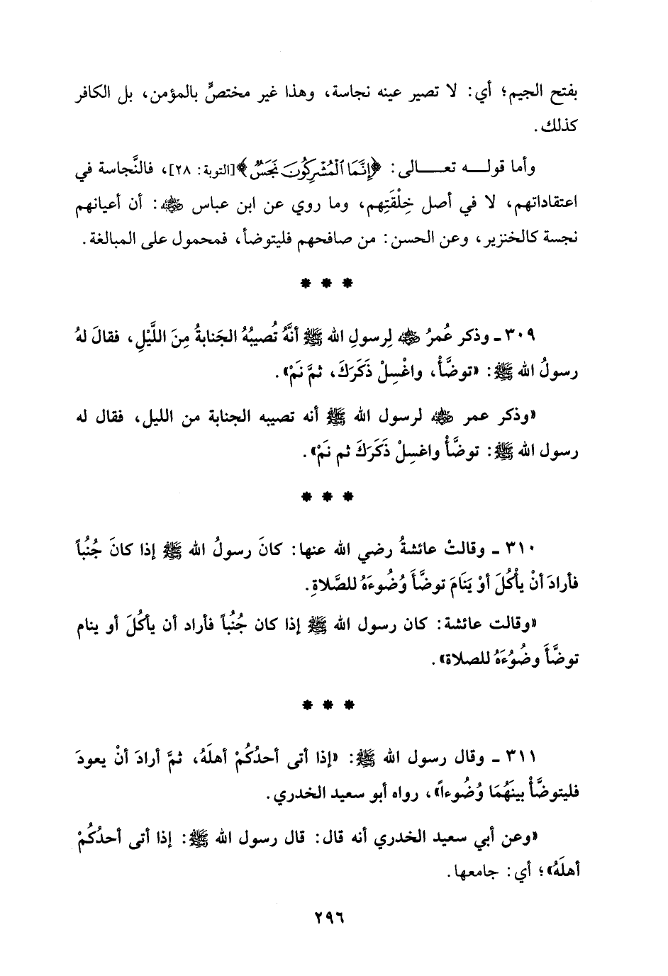 310 - وقالتْ عائشةُ رضي الله عنها: كانَ رسولُ الله - صلى الله عليه وسلم - إذا كانَ جُنُباً فأرادَ أنْ يأكل أوْ يَنَامَ توضَّأ وُضُوءَهُ للصَّلاةِ.