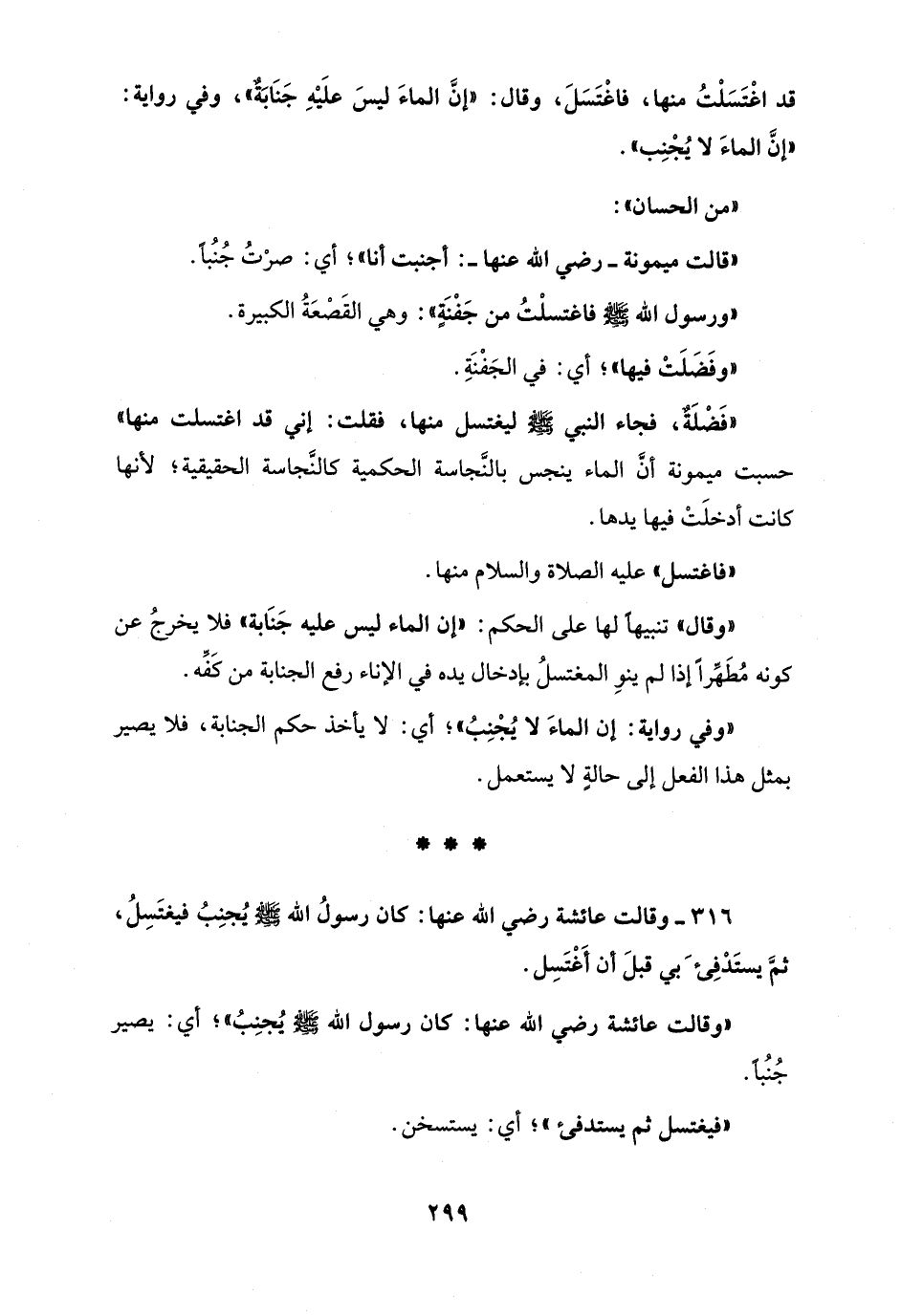 316 - وقالت عائشة رضي الله عنها: كان رسولُ الله - صلى الله عليه وسلم - يُجنِبُ فيغتَسِلُ، ثمَّ يستَدْفِئَ بي قبلَ أن أَغْتَسِل.