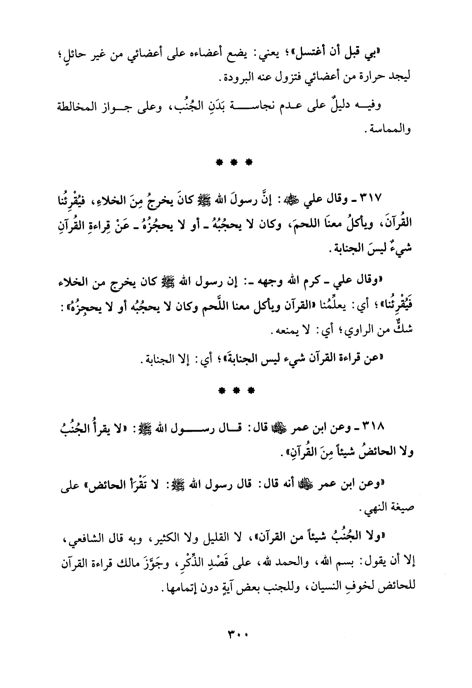 317 - وقال علي - رضي الله عنه -: إنَّ رسولَ الله - صلى الله عليه وسلم - كانَ يخرجُ مِنَ الخلاءِ، فيُقْرِئُنا القُرآنَ، ويأكلُ معنَا اللحمَ، وكان لا يحجُبُهُ - أو لا يحجُزُهُ - عَنْ قِراءةِ القُرآنِ شيءٌ ليسَ الجنابة.