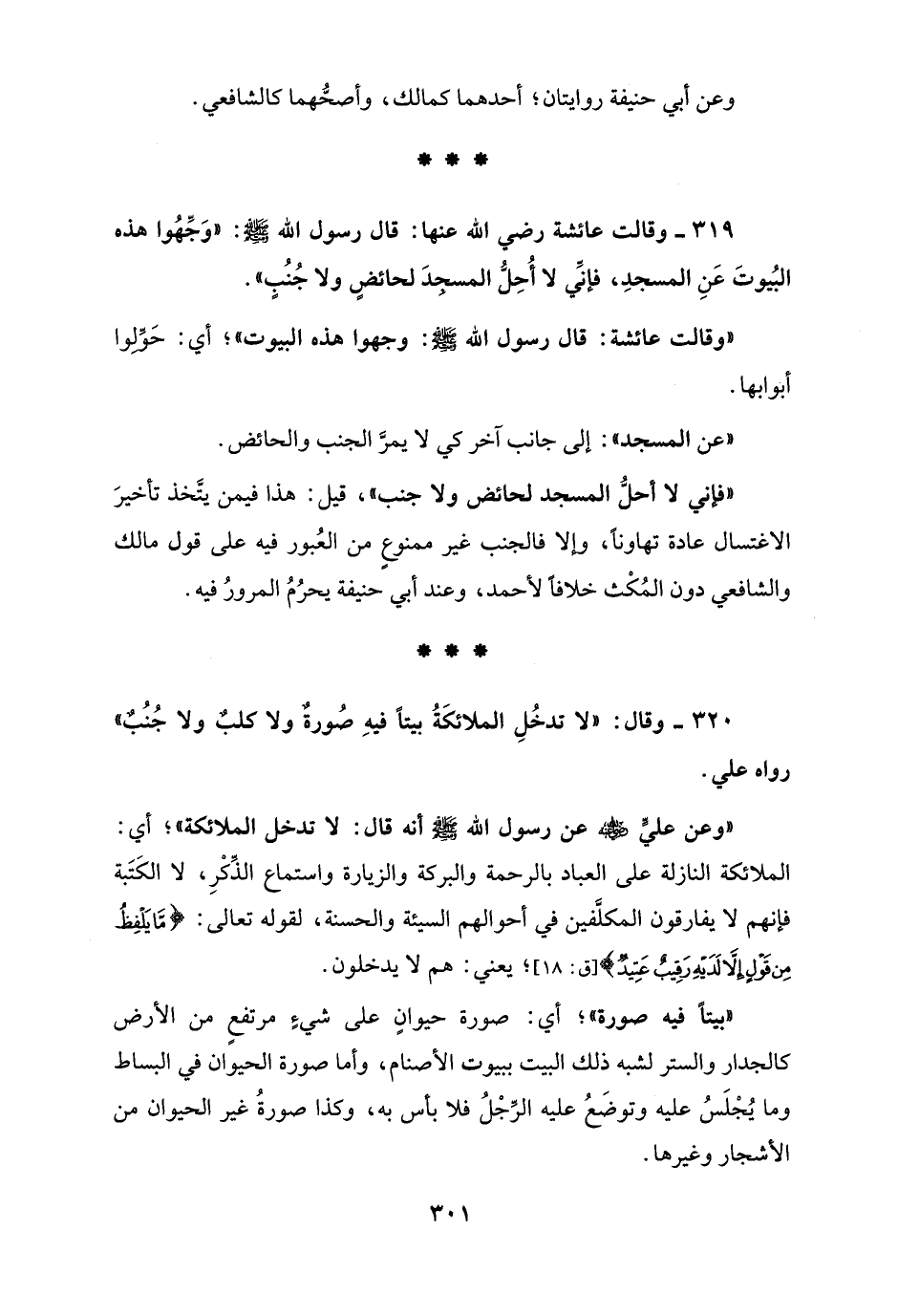 319 - وقالت عائشة رضي الله عنها: قال رسول الله - صلى الله عليه وسلم -: "وَجِّهُوا هذه البُيوتَ عَنِ المسجدِ، فإنِّي لا أُحِلُّ المسجدَ لحائضٍ ولا جُنُبٍ".