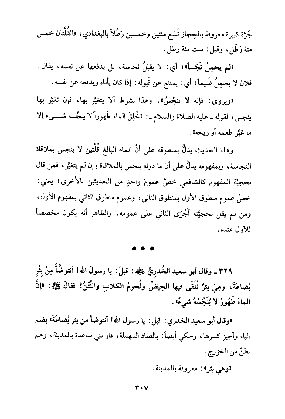 329 - وقال أبو سعيد الخُدرِيّ - رضي الله عنه -: قيلَ: يا رسولَ الله! أنتوضَّأ مِنْ بِئْرِ بُضاعَةَ، وهِيَ بئرٌ تُلْقَى فيها الحِيَضُ ولُحومُ الكلابِ والنتنُ؟ فقالَ - صلى الله عليه وسلم -: "إنَّ الماءَ طَهُورٌ لا يُنَجِّسُهُ شيءٌ".
