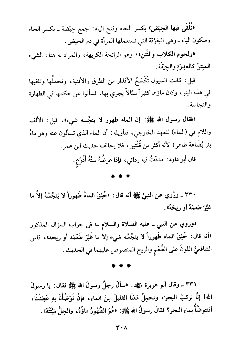 330 - ورُوي عن النبيِّ - صلى الله عليه وسلم - أنه قال: "خُلِقَ الماءُ طَهوراً لا يُنجِّسُهُ إلاَّ ما غيَّرَ طعمَهُ أو ريحَهُ".
