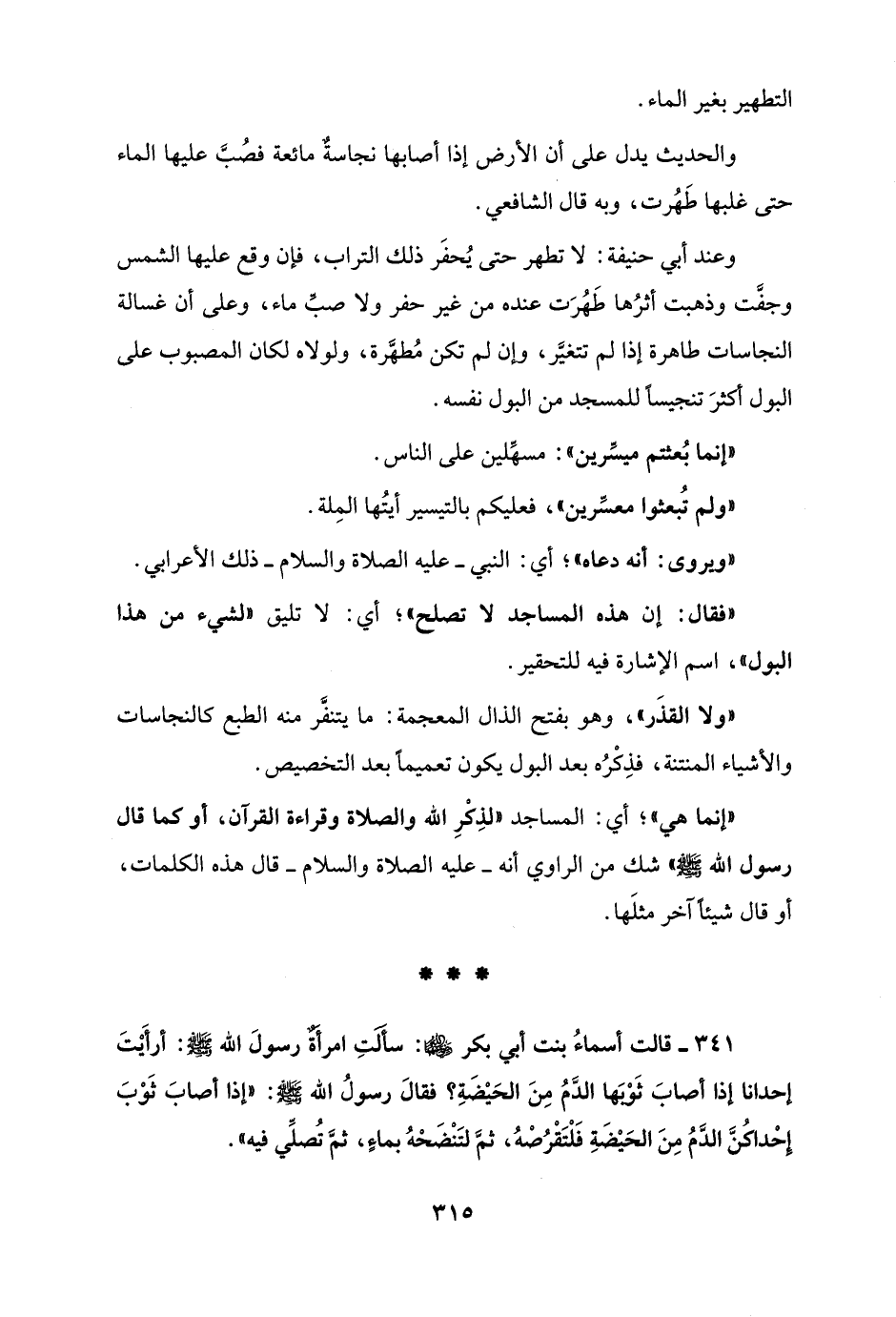 341 - قالت أسماءُ بنت أبي بكر: سألتِ امرأةٌ رسولَ الله - صلى الله عليه وسلم -: أرأَيْتَ إحدانا إذا أصابَ ثَوْبَها الدَّمُ مِنَ الحَيْضَةِ؟ فقالَ رسولُ الله - صلى الله عليه وسلم -: "إذا أصابَ ثَوْبَ إحْداكُنَّ الدَّمُ مِنَ الحَيْضَةِ فَلْتَقْرُصْهُ، ثمَّ لتَنْضَحْهُ بماءً، ثمَّ تُصلِّي فيه".