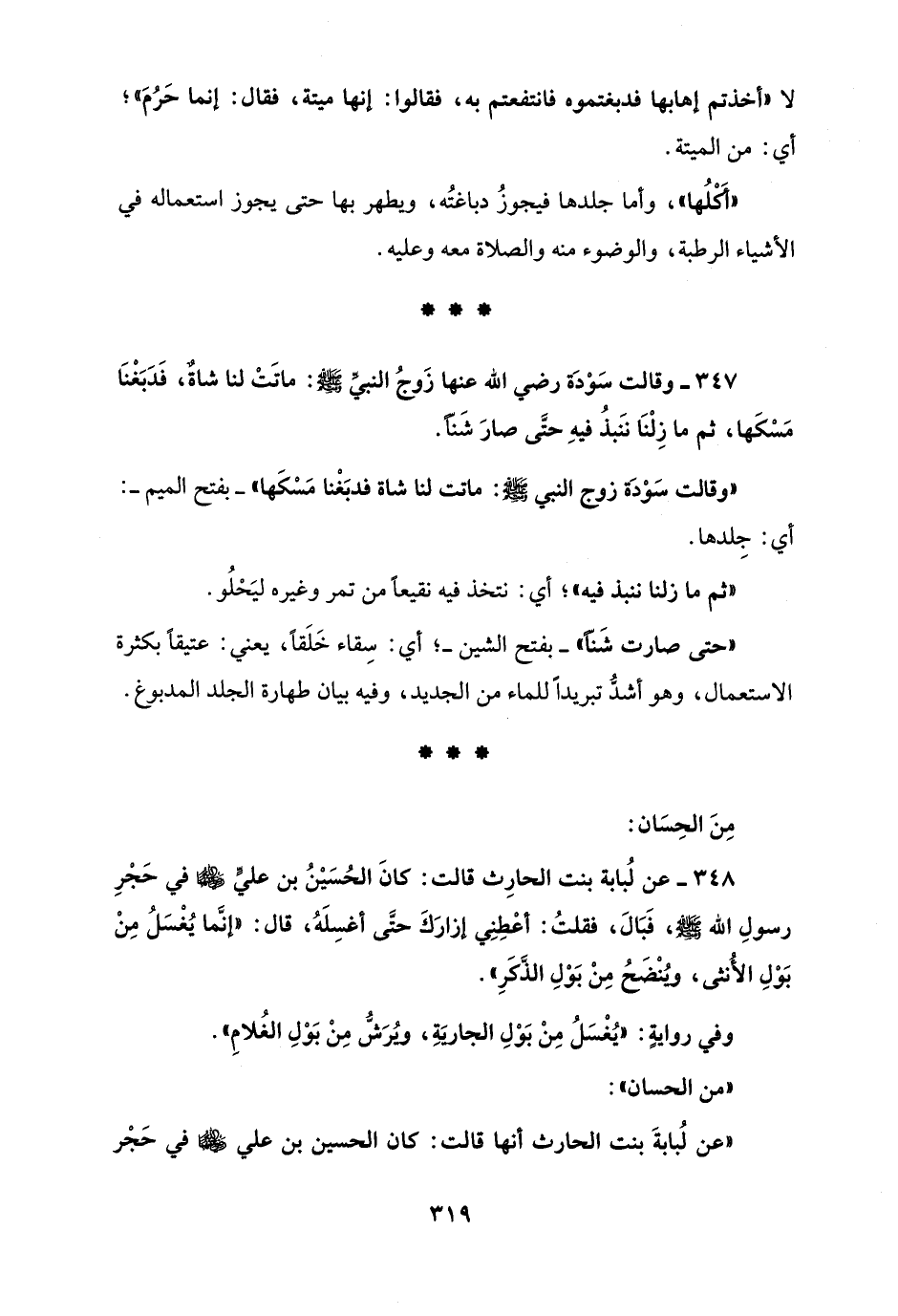 347 - وقالت سَوْدَة رضي الله عنها زَوجُ النَّبِيّ - صَلَّى اللهُ عَلَيْهِ وَسَلَّمَ -: ماتَتْ لنا شاةٌ، فَدَبَغْنَا مَسْكَها، ثم ما زِلْنَا ننَبذُ فيهِ حتَّى صارَ شَنًّا.
