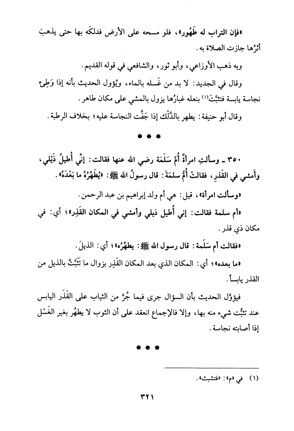 "أم سلمة فقالت: إنِّي أُطيل ذيلي وأمشي في المكان القَذِر"؛ أي: في مكان ذي قذر.