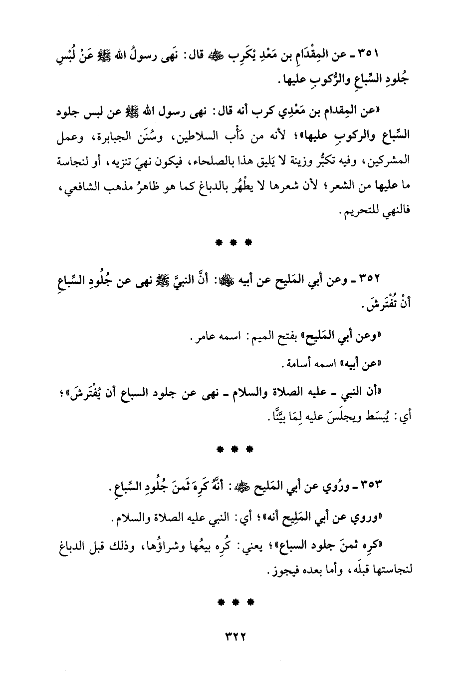 351 - عن المِقْدَامِ بن مَعْدِ يْكَرِب - رضي الله عنه - قال: نَهى رسولُ الله - صلى الله عليه وسلم - عَنْ لُبْسِ جُلودِ السّباعِ والرُّكوبِ عليها.