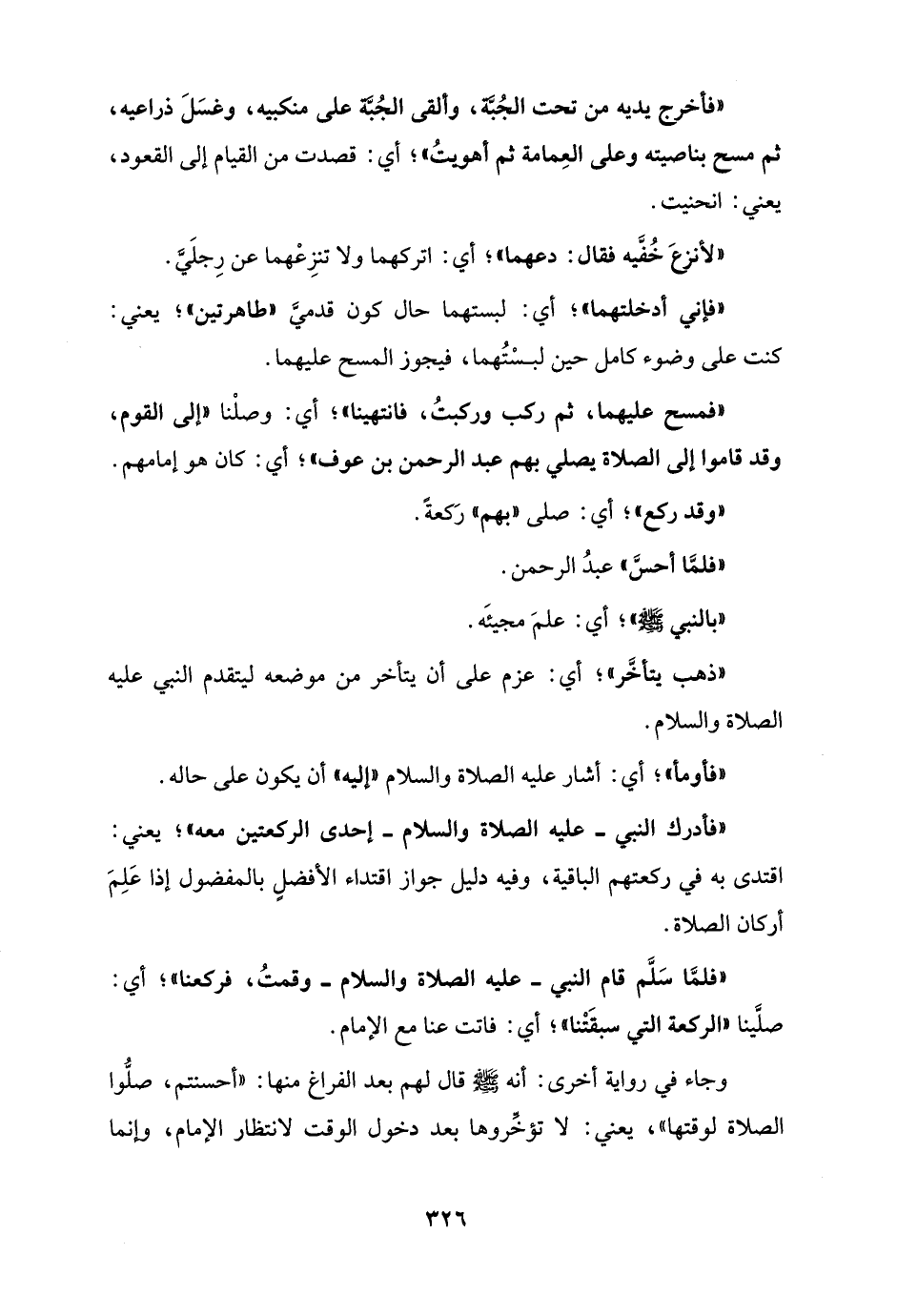 "فمسح عليهما، ثم ركب وركبتُ، فانتهينا"؛ أي: وصلْنا "إلى القوم، وقد قاموا إلى الصلاة يصلي بهم عبد الرَّحْمَن بن عوف"؛ أي: كان هو إمامهم.