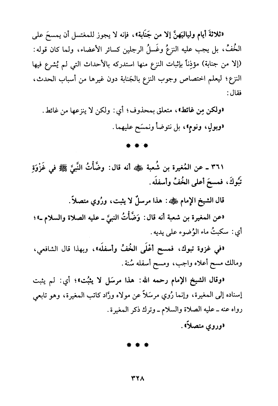 361 - عن المُغيرة بن شُعبة - رضي الله عنه - أنَّه قال: وضَّأْتُ النَّبيَّ - صلى الله عليه وسلم - في غزوةِ تبوك، فمسحَ أعلى الخُفِّ وأسفله.