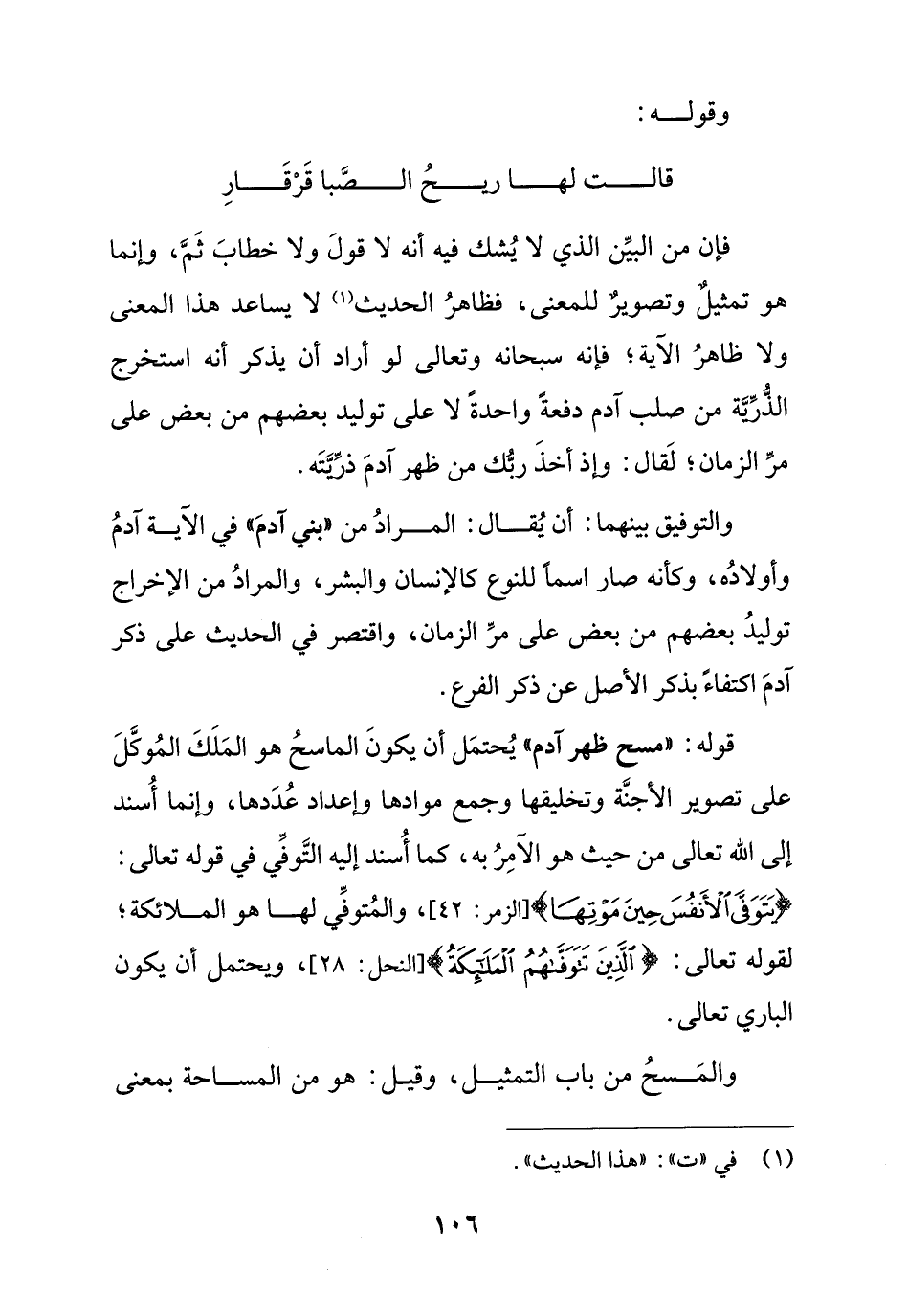 قوله:" مسح ظهر آدم " يحتمل أن يكون الماسح هو الملك الموكل على تصوير الأجنة وتخليقها وجمع موادها وإعداد عددها, وإنما أسند إلى الله تعالى من حيث هو الآمر به, كما أسند إليه التوفي في قوله تعالى {الله يتوفى الأنفس حين موتها} [الزمر: 42] والمتوفي لها هو الملائكة ولقوله تعالى: {الذين تتوفاهم الملائكة} [النحل: 28] ويحتمل أن يكون الباري تعالى.