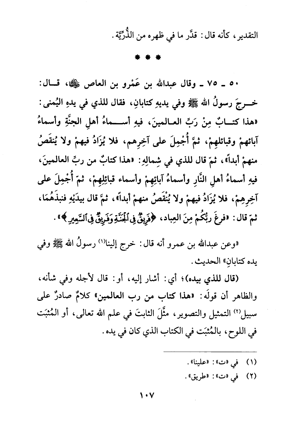 50 – 75 – وقال عبد الله بن عمرو بن العاص رضي الله عنهما قال: خرج رسول الله - صلى الله عليه وسلم - وفي يده كتابان, فقال للذي في يده اليمنى: " هذا كتاب من رب العالمين, فيه أسماء أهل الجنة وأسماء آبائهم وقبائلهم, ثم أجمل على آخرهم, فلا يزاد فيهم ولا ينقص منهم أبدا " ثم قال للذي في شماله:" هذا كتاب من رب العالمين, فيه أسماء أهل النار وأسماء آبائهم وأسماء قبائلهم, ثم أجمل على آخرهم, فلا يزاد فيهم ولا ينقص منهم أبدا" ثم قال: بيديه فنبذهما, ثم قال: " فرغ ربكم من العباد, {فريق في الجنة وفريق في السعير} ".