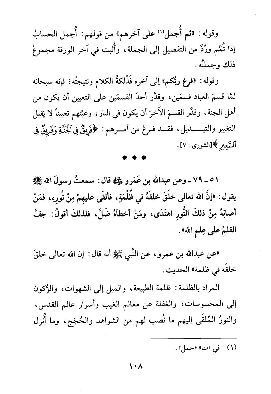 51 – 79 – وعن عبد الله بن عمرو - رضي الله عنه - قال: سمعت رسول الله - صلى الله عليه وسلم - يقول:" إن الله تعالى خلق خلقه في ظلمة, فألقى عليهم من نوره, فمن أصابه من ذلك النور اهتدى, ومن أخطأه ضل, فلذلك أقول: جف القلم على علم الله ".