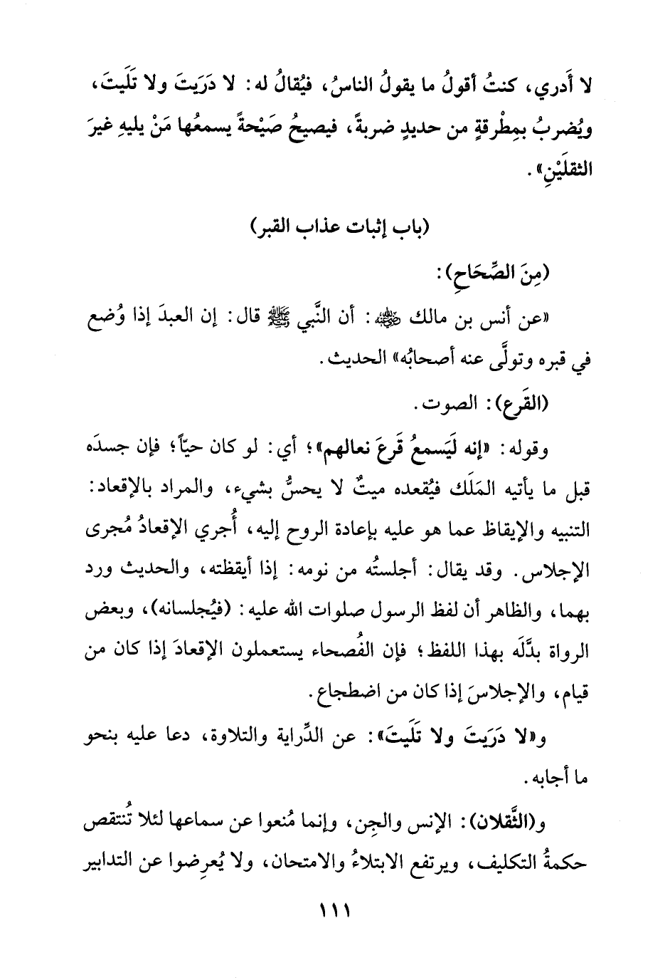 لا أدري كنت أقول ما يقول الناس, فيقال له: لا دريت ولا تليت, ويضرب بمطرقة من حديد ضربة, فيصيح صيحة يسمعها من يليه غير الثقلين ".