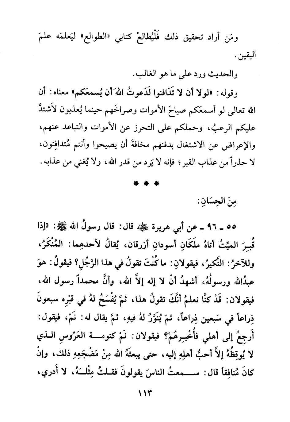 55 - 96 – عن أبي هريرة رضي الله عنه قال: قال رسول الله صلى الله عليه وسلم:" إذا قبر الميت أتاه ملكان أسودان أزرقان, يقال لأحدهما: المنكر وللآخر النكير, فيقولان: ما كنت تقول في هذا الرجل؟ فيقول: هو عبد الله ورسوله, أشهد أن لا إله إلا الله, وأن محمدا رسول الله, فيقولان: قد كنا نعلم أنك تقول هذا, ثم يفسح له في قبره سبعون ذراعا في سبعين ذراعا, ثم ينور له فيه وثم يقال له: نم, فيقول: أرجع إلى أهلي فأخبرهم؟ فيقولان: نم كنومة العروس الذي لا يوقظه إلا أحب أهله إليه, حتى يبعثه الله من مضجعه ذلك, وإن كان منافقا قال: سمعت الناس يقولون فقلت مثله, لا أدري
