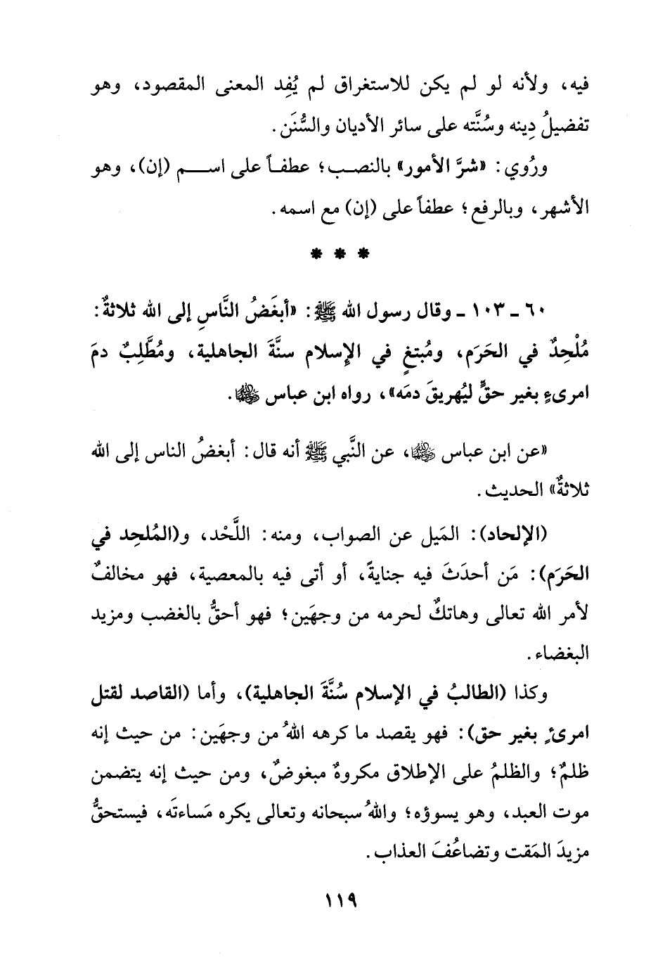 60 - 103 - وقال رسول الله صلى الله عليه وسلم: " أبغض الناس إلى الله ثلاثة: ملحد في الحرم, ومبتغ في الإسلام سنة الجاهلية, ومطلب دم امريء بغير حق ليهريق دمه ". رواه ابن عباس رضي الله عنه.