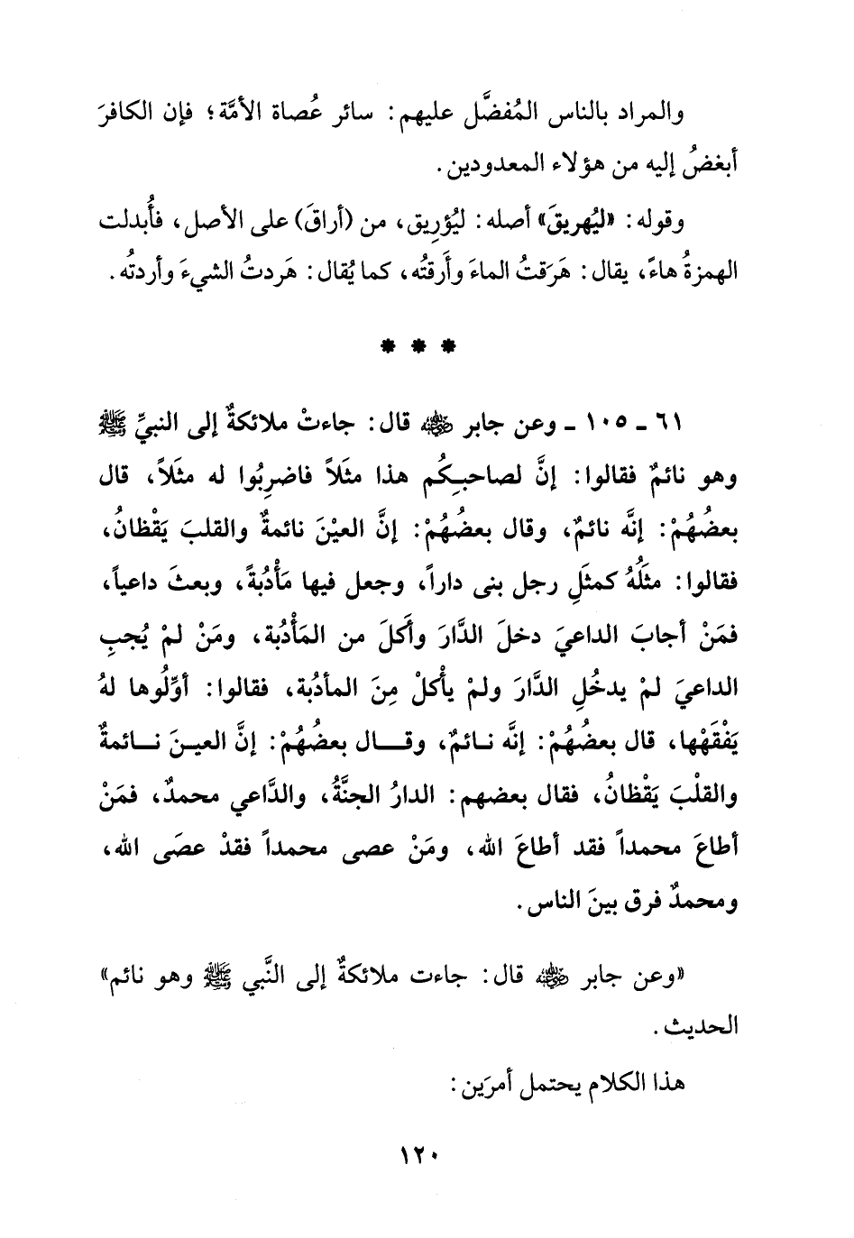 61 - 105 - وعن جابر رضي الله عنه قال:: جاءت الملائكة إلى النبي صلى الله عليه وسلم وهو نائم فقالوا: إن لصاحبكم هذا مثلا فاضربوا له مثلا, قال بعضهم ك إنه نائم, وقال بعضهم: إن العين نائمة والقلب يقظان, فقالوا: مثله كمثل رجل بنى دارا, وجعل فيها مأدبة, وبعث داعيا, فمن أجاب الداعي دخل الدار وأكل من المأدبة, ومن لم يجب الداعي لم يدخل الدار ولم يأكل من المأدبة, فقالوا: أولوها له يفقهها, قال بعضهم: إنه نائم, وقال بعضهم: إن العين نائمة والقلب يقظان, فقال بعضهم: الدار الجنة, والداعي محمد, فمن أطاع محمدا فقد أطاع الله, ومن عصى محمدا فقد عصى الله, ومحمد فرق بين الناس.