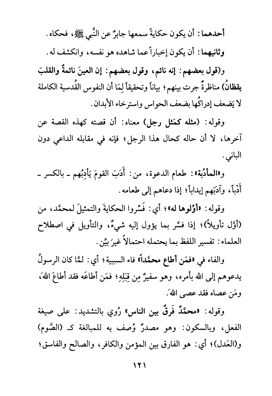 وقوله:" محمد فرق بين الناس " روي بالتشديد: على صيغة الفعل , وبالسكون: وهو مصدر وصف به للمبالغة كـ (الصوم) و (العدل) أي: هو الفارق بين المؤمن والكافر , والصالح والفاسق ,
