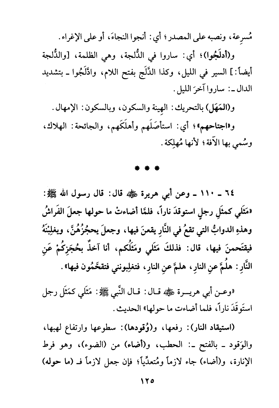 64 - 110 – وعن أبي هريرة رضي الله عنه قال: قال رسول الله صلى الله عليه وسلم: "مثلي كمثل رجل استوقد نارا , فلما أضاءت ما حولها جعل الفراش وهذه الدواب التي تقع في النار يقعن فيها , وجعل يحجزهن , ويغلبنه فيقتحمن فيها , قال: فذلك مثلي ومثلكم , أنا آخذ بحجزكم عن النار , هلم عن النار , هلم عن النار , فتغلبوني فتقحمون فيها ".