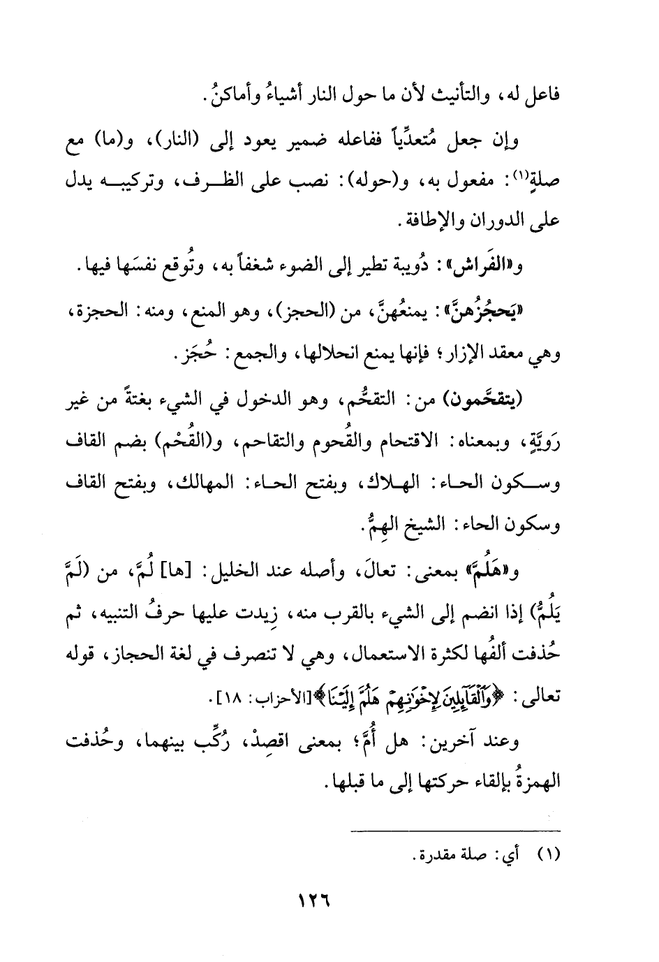 و"هلم" بمعنى: تعال ,وأصله عند الخليل: [ها] لم , من (لم يلم) إذا انضم إلى الشيء بالقرب منه , زيدت عليها حرف التنبيه , ثم حذفت ألفها لكثرة الاستعمال , وهي لا تنصرف في لغة الحجاز , قوله تعالى: {والقائلين لإخوانهم هلم إلينا} [الأحزاب: 18].
