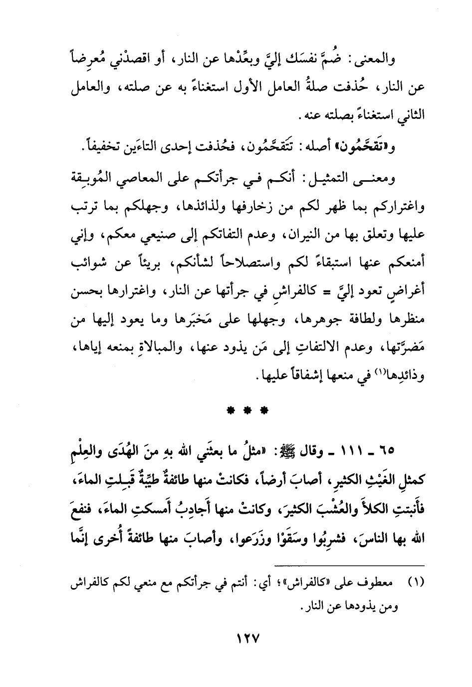 65 - 111 – وقال صلى الله عليه وسلم:" مثل ما بعثني الله به من الهدى والعلم كمثل الغيث الكثير , أصاب أرضا , فكانت منها طائفة طيبة قبلت الماء , فأنبتت الكلأ والعشب الكثير , وكانت منها أجادب أمسكت الماء , فنفع الله بها الناس , فشربوا وسقوا وزرعوا , وأصاب منها طائفة أخرى إنما